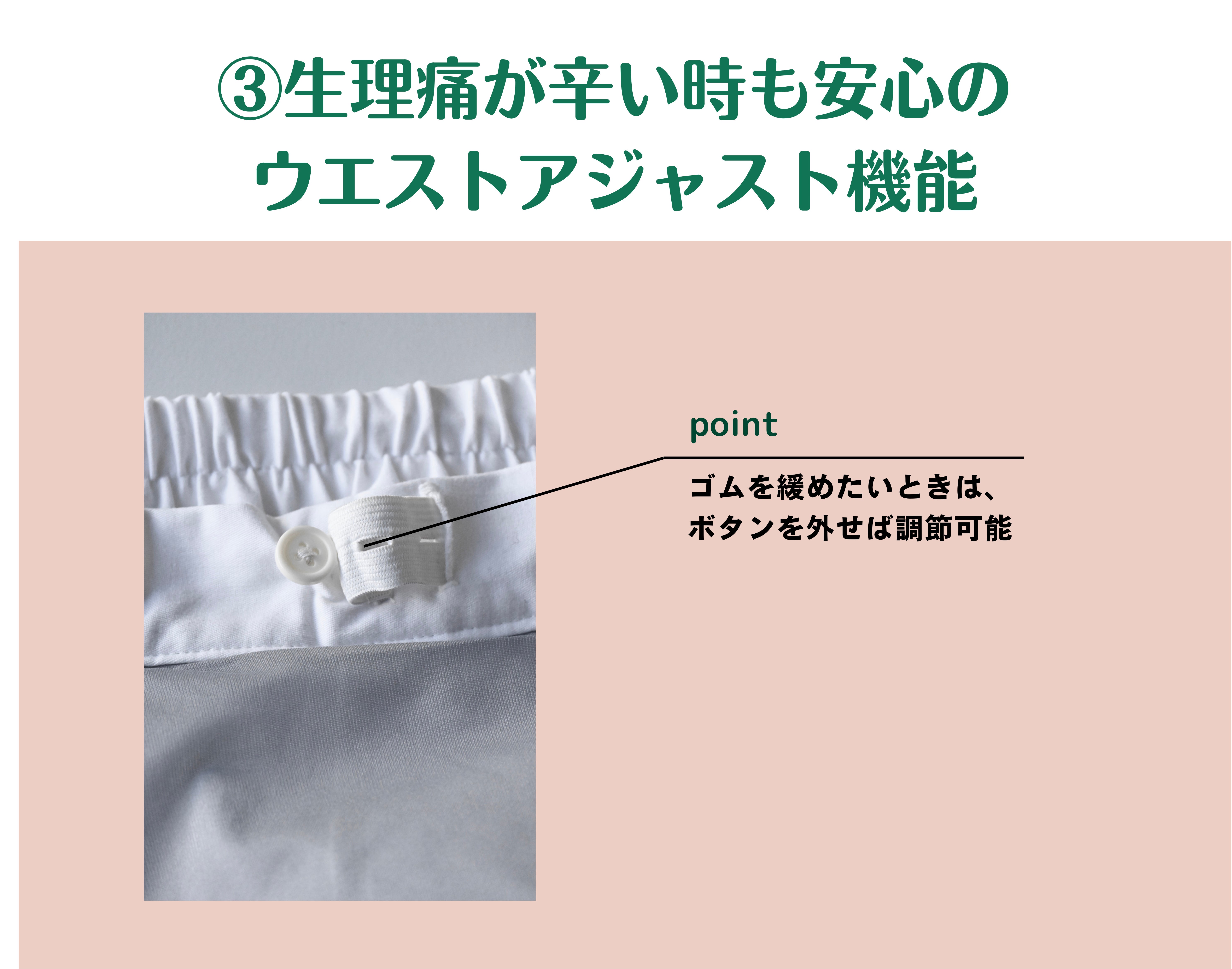 生理痛が辛い時はウエストゴムでさえ苦しいと感じてしまうことも…。そんな時も安心して履けるウエストアジャスト機能を搭載しました。ボタンで簡単にゴムを緩めることが出来ます。