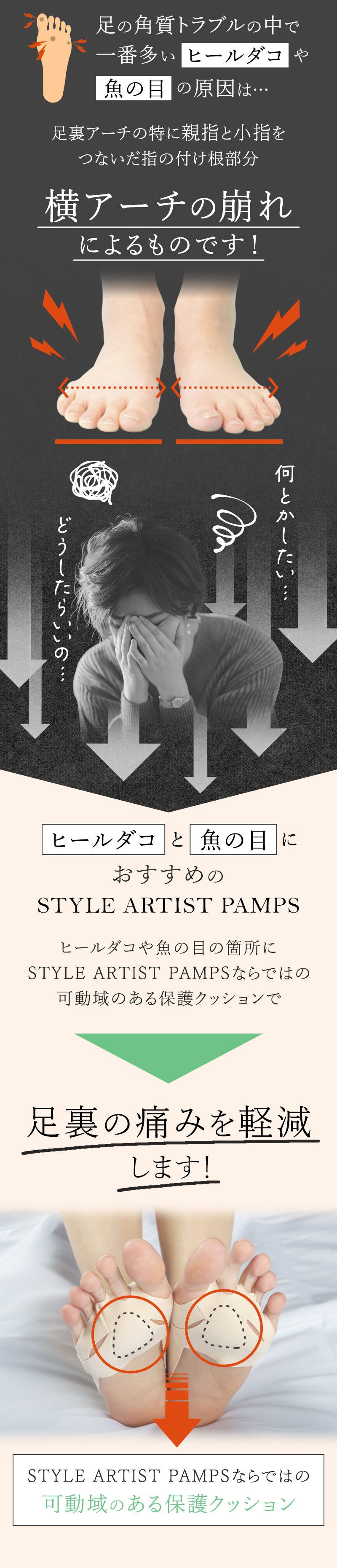 ヒールダコや魚の目の箇所にSTYLE ARTIST PAMPSならではの保護クッションで歩行時や立ち仕事の足裏の痛みを軽減します。