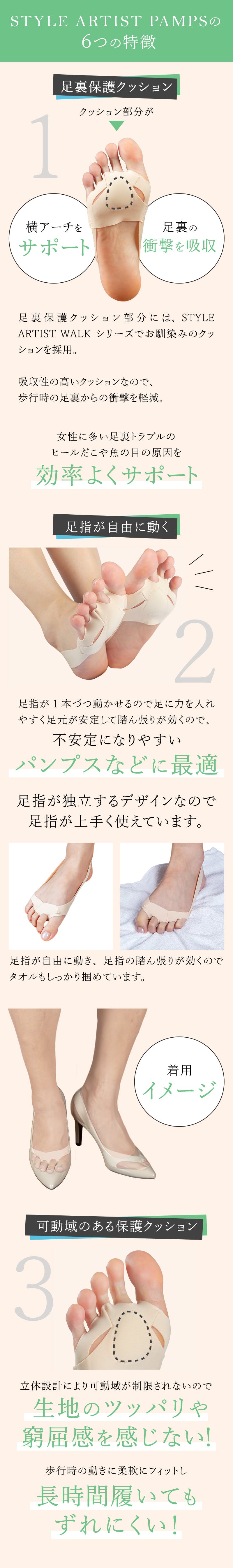 STYLE ARTIST PAMPSは、足裏保護クッションと足の指が自由に動かせる足の甲部分のWサポートでパンプスを履いた時の足の疲れや痛みをサポート。歩きやすさと疲れにくさを実現しています。ストッキングや靴下の中に履けるので好きなパンプスやヒールの中に履くだけ、お気に入りの靴でお出かけできます。