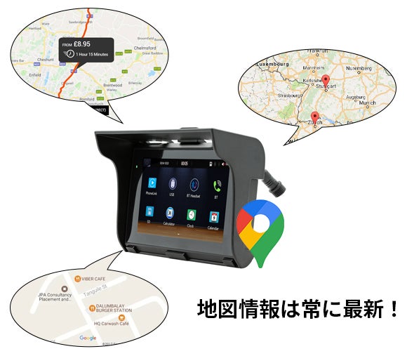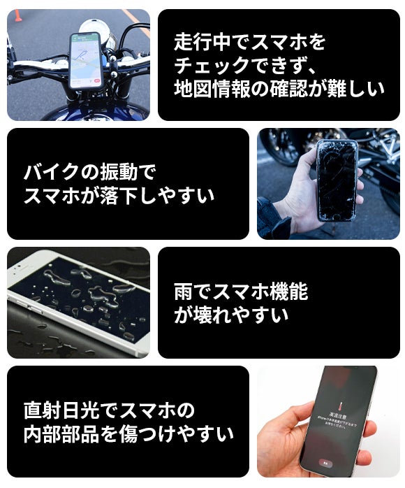 ※日本の道路交通法により、バイク走行中にスマホを通話したり、テキストメッセージを送信したりすることは交通規則に違反する可能性がありますのでご注意ください。