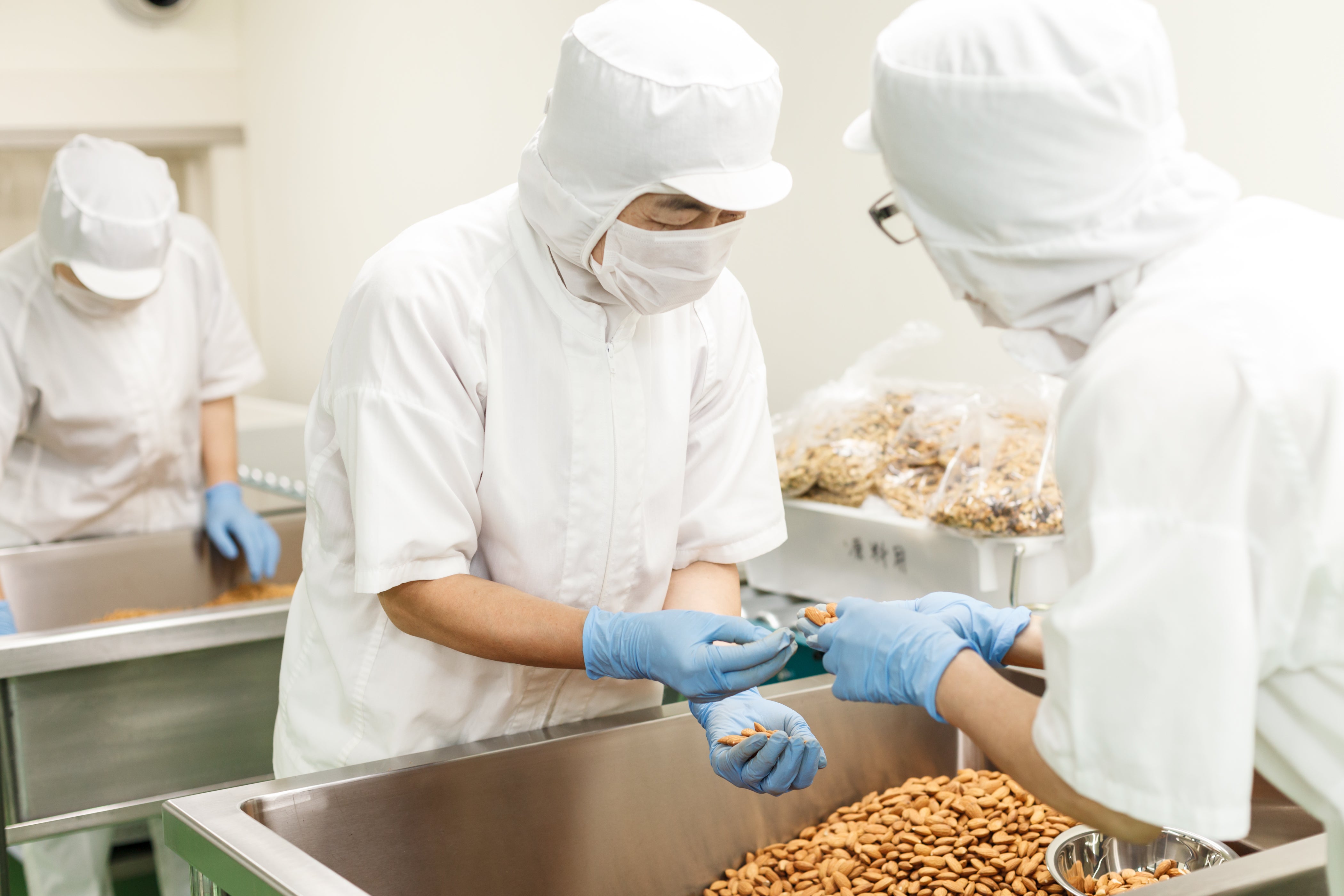 私たちの有機工場の自慢は検品工程。専門チームが傷んだ実や枝や小石などの混入が無いか、文字通り1粒1粒確認しています。確認方法も素材を特性に向き合い、最適な方法を選択。例えばデーツの実はピンセットを通して外からは見えない実の内部に異常がないかを確認したり、レーズンはオイルコートがされていないので実と実が結着し塊になっていますが、手でほぐし1つ1つの実をチェックしています。