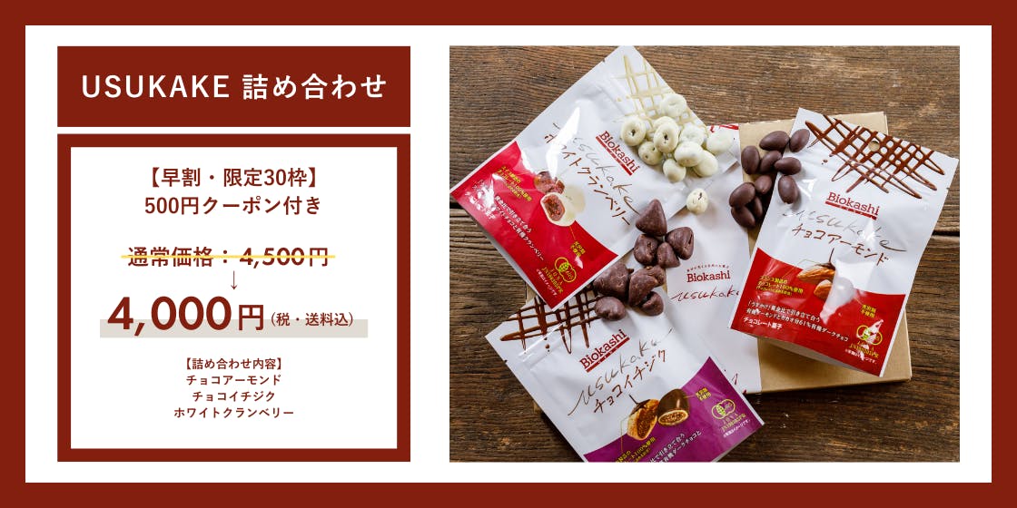 牧さんもお子さんと取り合っていただいてるUSKAKE!早割の「USUKAKE体験セット」まだ残り枠がございます。口に含んだ瞬間から違いがわかるオーガニックチョコレートのお菓子、堪能いただきたいです。