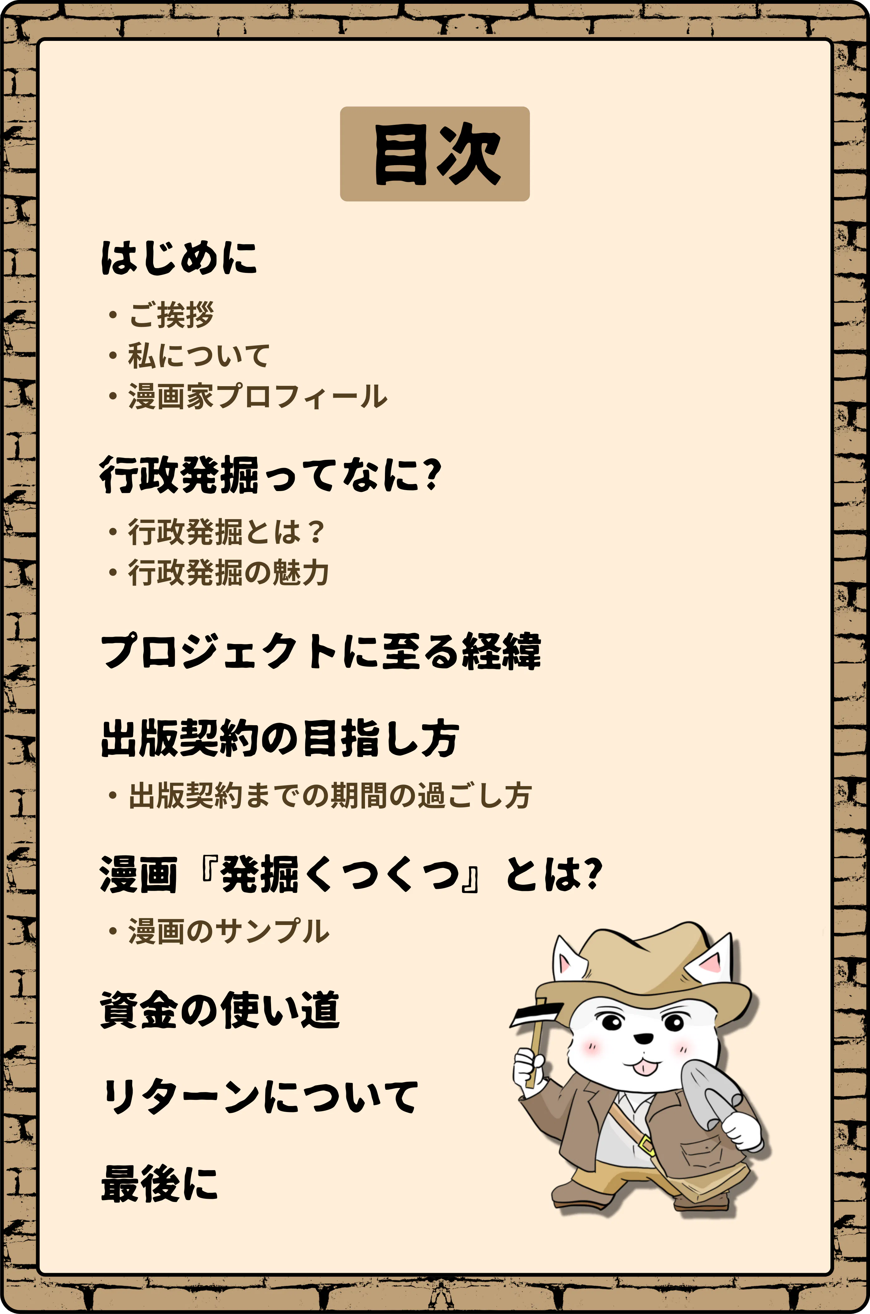はじめまして!このプロジェクトに興味を持っていただきありがとうございます。まず、こちらのページの目次は以下の通りです。