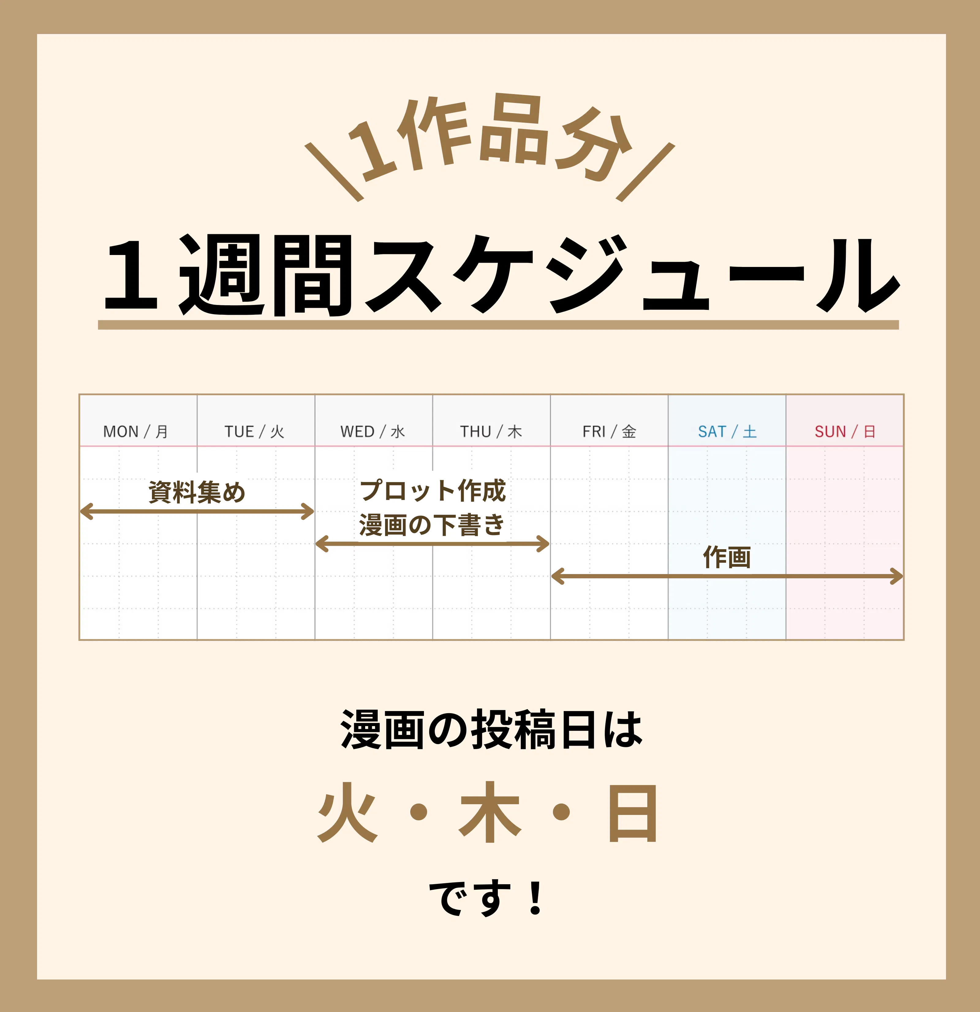 シンプルですがこれしかありません。実際にコミックエッセイ化した経験を通じてチームでsnsでの宣戦略等を考えたうえ、プロの編集者にも相談しながらプロットを練っています。着実にカタチにする為にも皆さんのご支援を頂ければと思います。作者の一週間のスケジュールは以下のとおりです↓