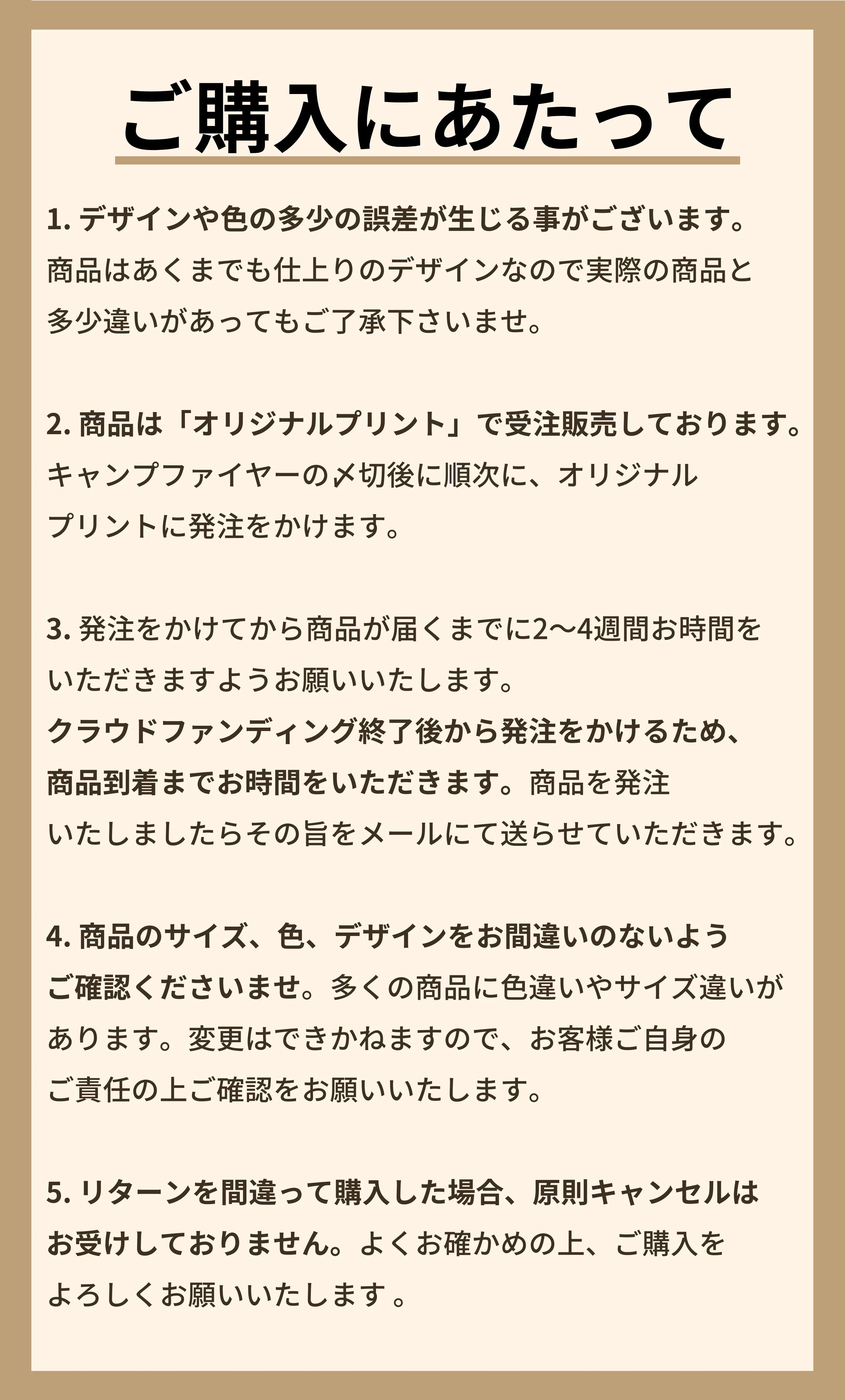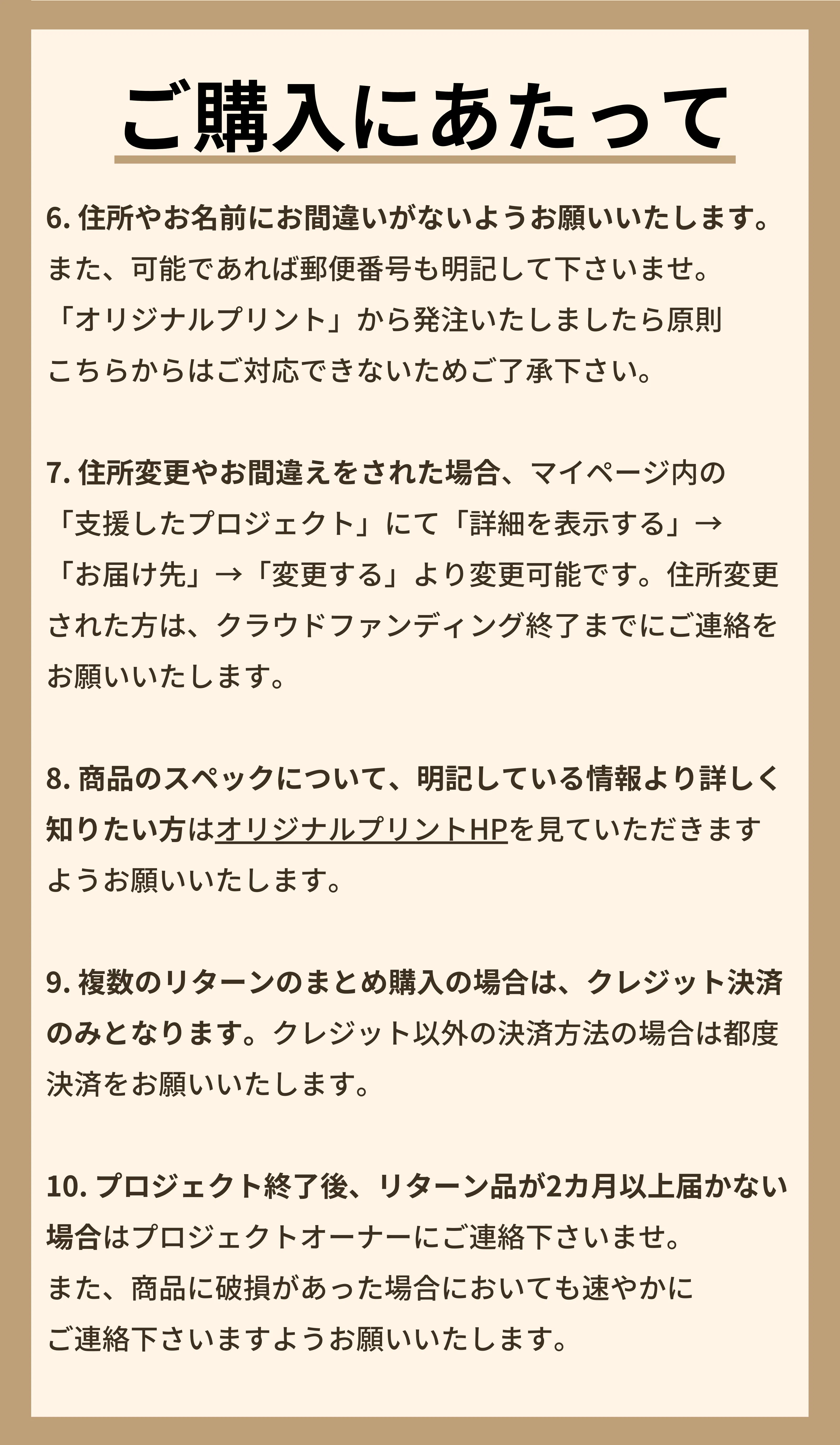 返礼品は受注生産です。皆様にリターンを購入していただいてからオリジナルプリントへ発注をかけます。リターン金にはグッズ制作費の他、デザイナーへの支払い、包装代、送料も含まれております。