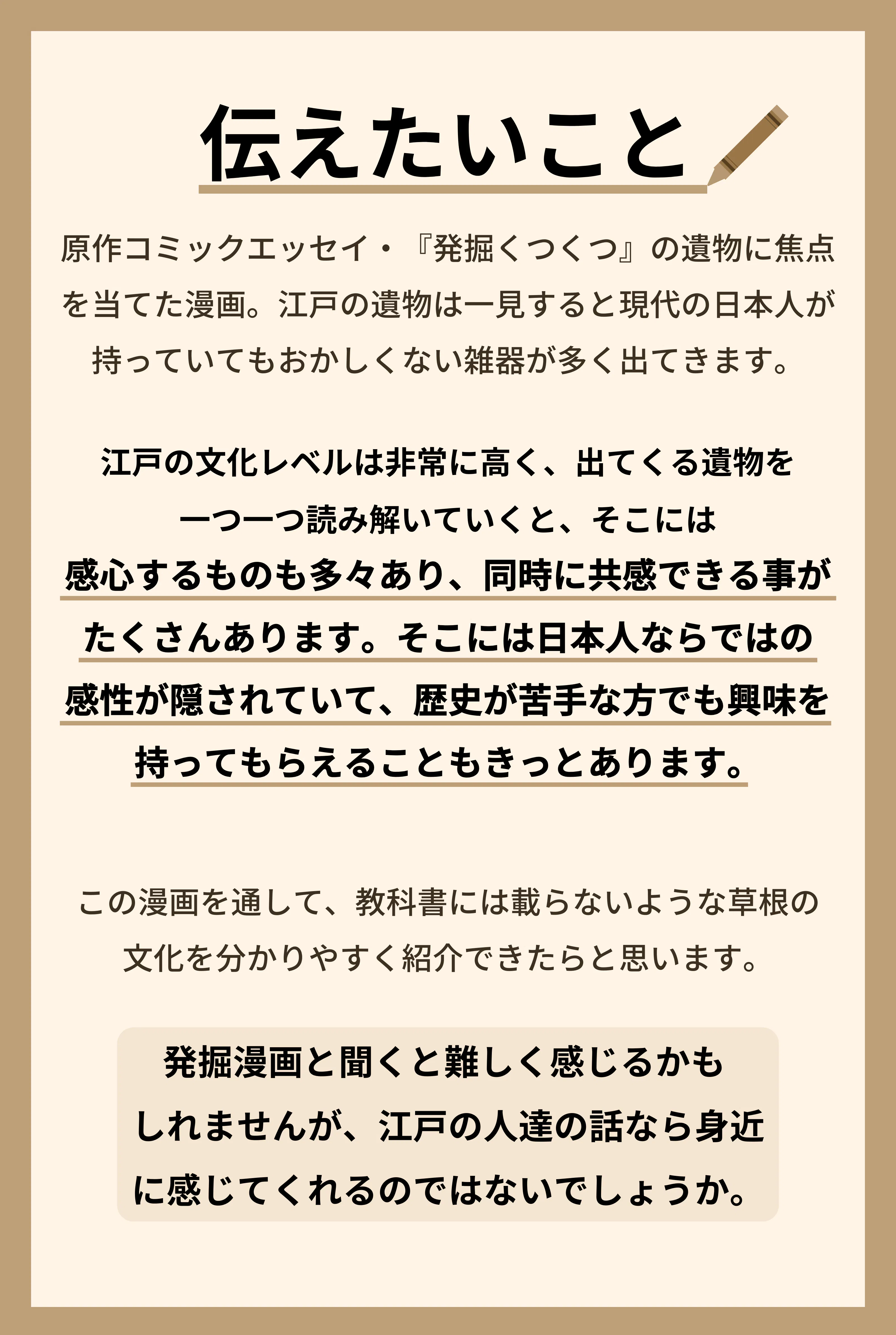 『発掘くつくつ』は考古学はもちろん、江戸時代や日本の歴史など、幅広い知識が必要になる漫画です。皆様にできるだけ正しい情報をお伝えする為に作家自身が資料を集め、勉強し、取材などにも実際に足を運び体験して参ります。