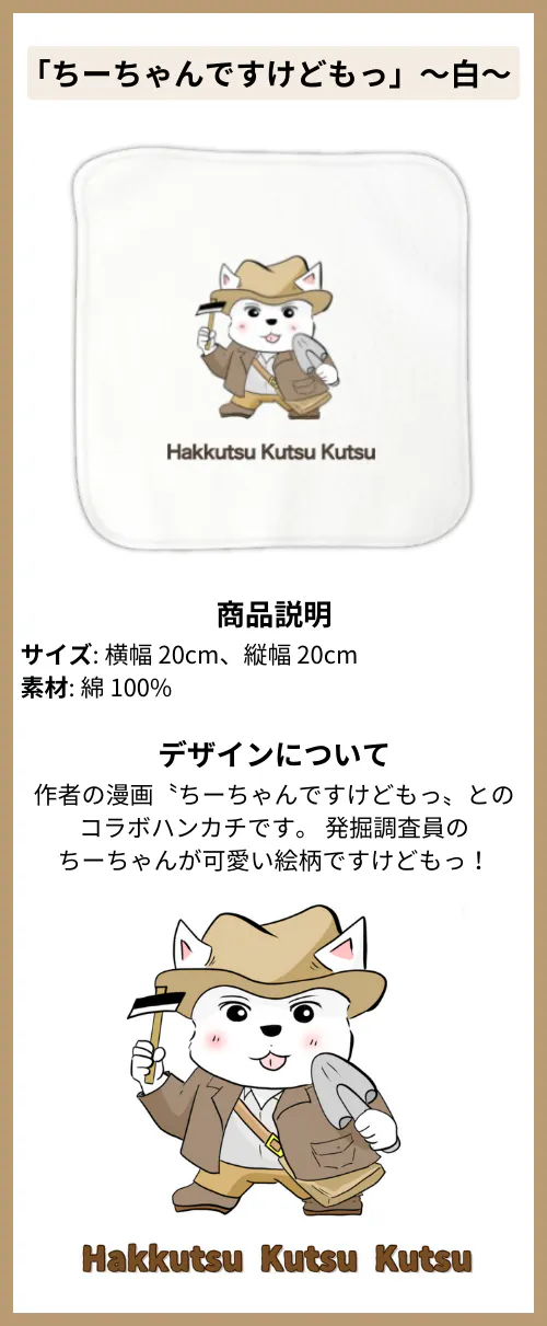 作者の漫画〝ちーちゃんですけどもっ〟とのコラボハンカチです。 発掘調査員のちーちゃんが可愛い絵柄ですけどもっ!