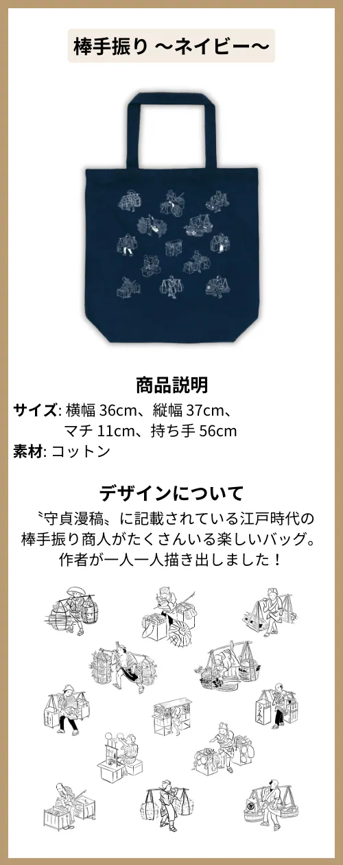 〝守貞漫稿〟に記載されている江戸時代の棒手振り商人がたくさんいる楽しいトートバッグ。作者が一人一人描き出しました!