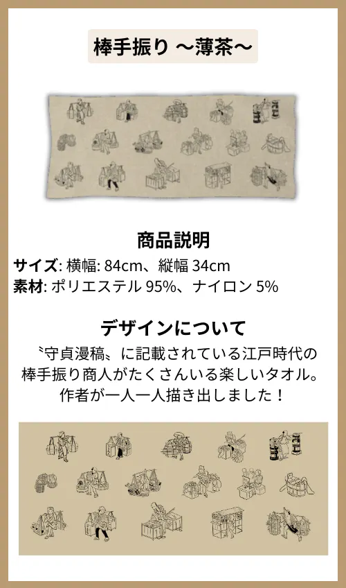 〝守貞漫稿〟に記載されている江戸時代の棒手振り商人がたくさんいる楽しいハンカチ。作者が一人一人描き出しました!