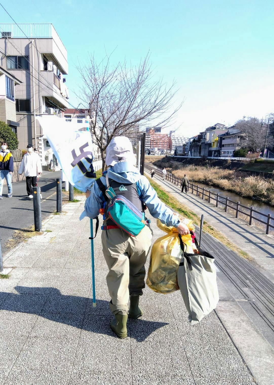 この陸域のごみは、大雨が降り増水して、大栗川の水かさが2~3ⅿ増えた時に、陸域の植物にプラスチックごみ(特にレジ袋、ビニール袋、容器包装類)が引っ掛かり、水が引いて残されたごみです。植物に絡まっているので、ごみを取るのも容易ではなく、水の中のごみを拾うよりも何倍も大変な作業になります。
