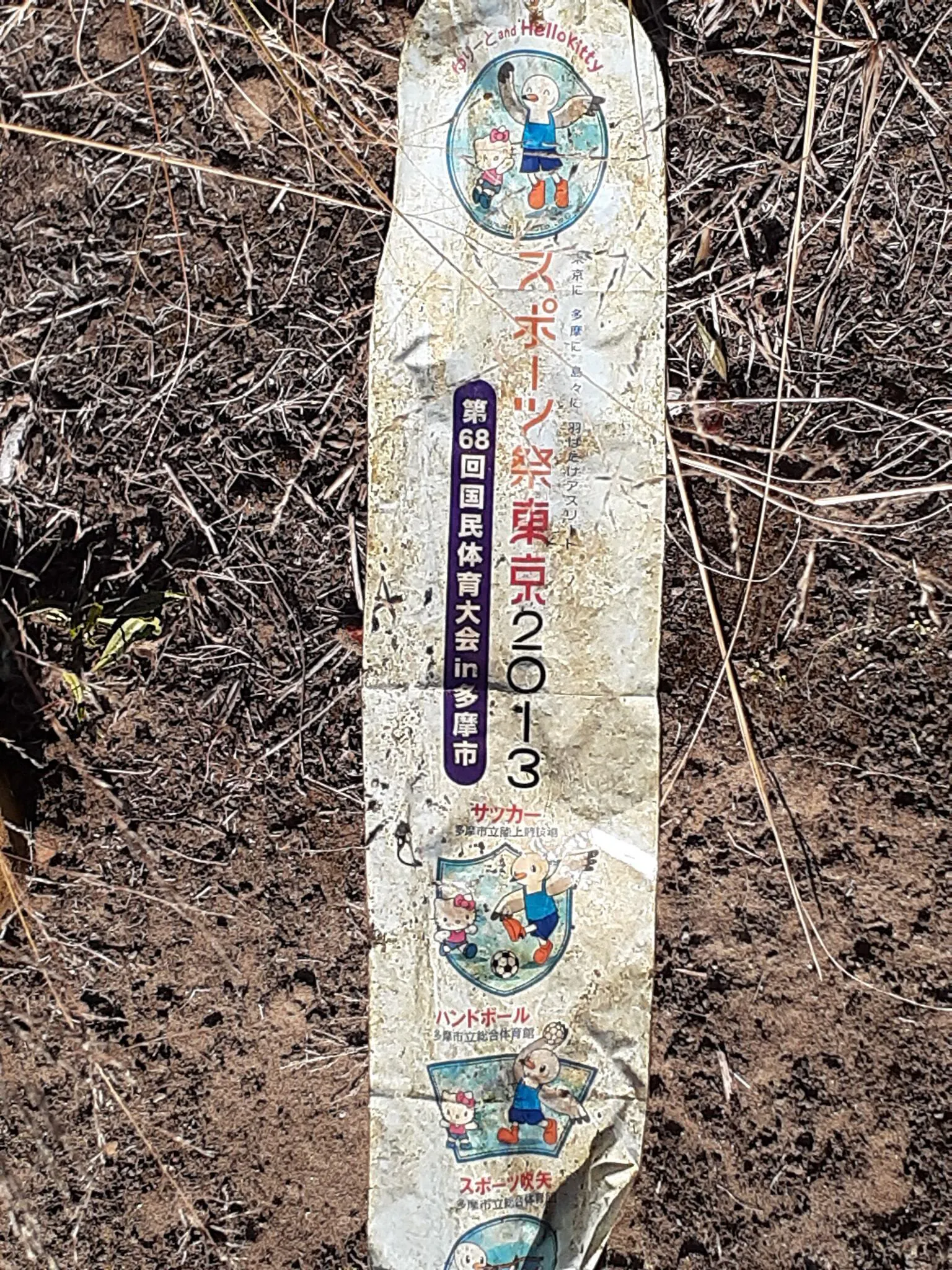 「スポーツ祭東京2013 第68回国民体育大会in多摩市」の表記があったプラ袋。引っ越しなどで捨てられたごみとは思うけれど、こんなごみを拾うと、なんだかやるせない気持ちになる。。。