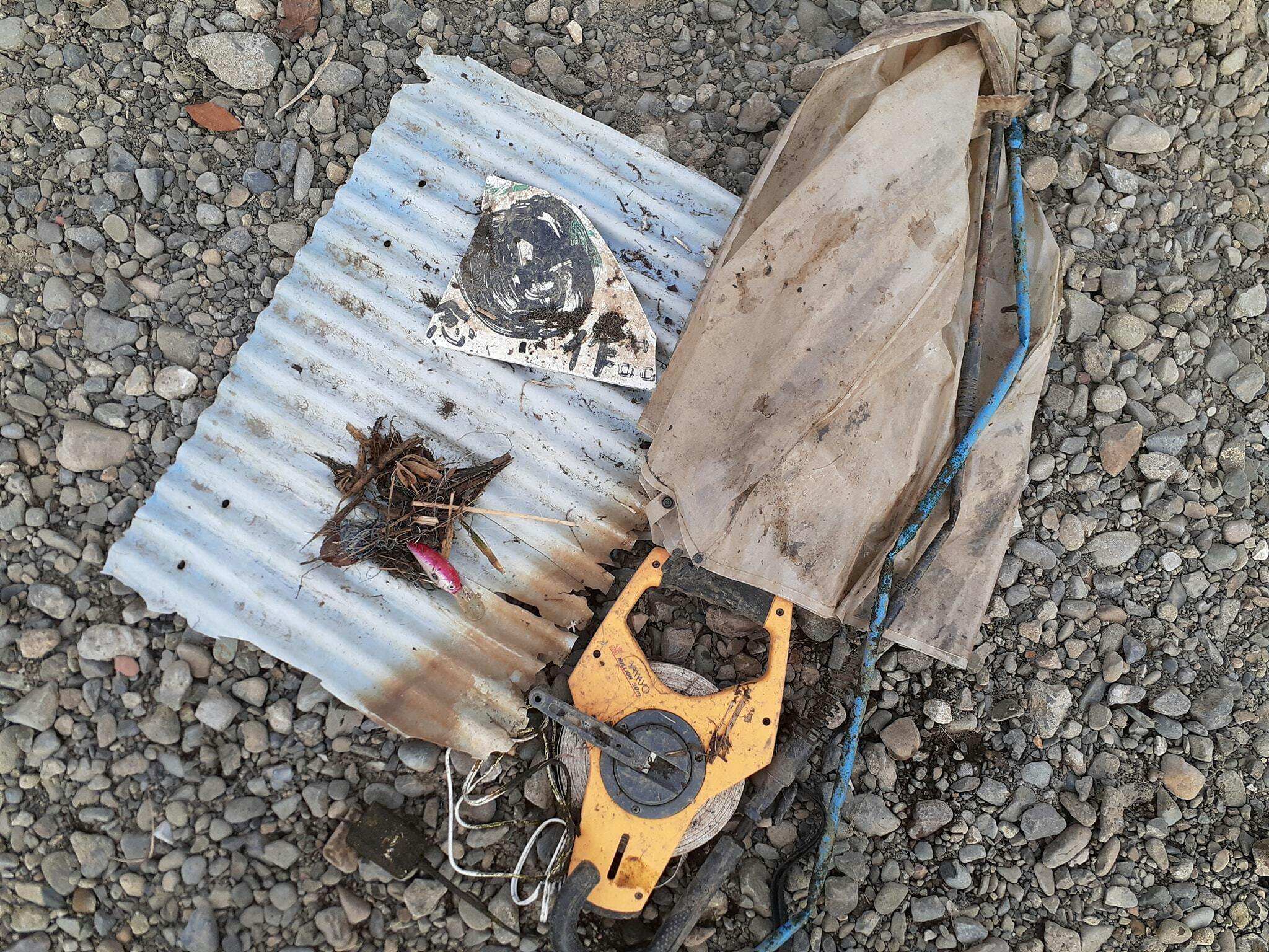 ●この日、最も頭に来たごみは、釣りの疑似餌の付いた釣り糸でした。川の中に青い糸が見えたので、引っ張ったら、その先は陸に続いていて草むらに疑似餌が巻き付いていました。回収する際、疑似餌の針がゴム手袋を貫いて一瞬指先に当たりました。怪我はしなかったものの、子どもが手を出したらどうなったかと思いました。前日には釣竿もみつかりましたし、1/2にも釣り道具とパッケージがみつかっています。釣りをする人のマナーの悪さが目立ちます。