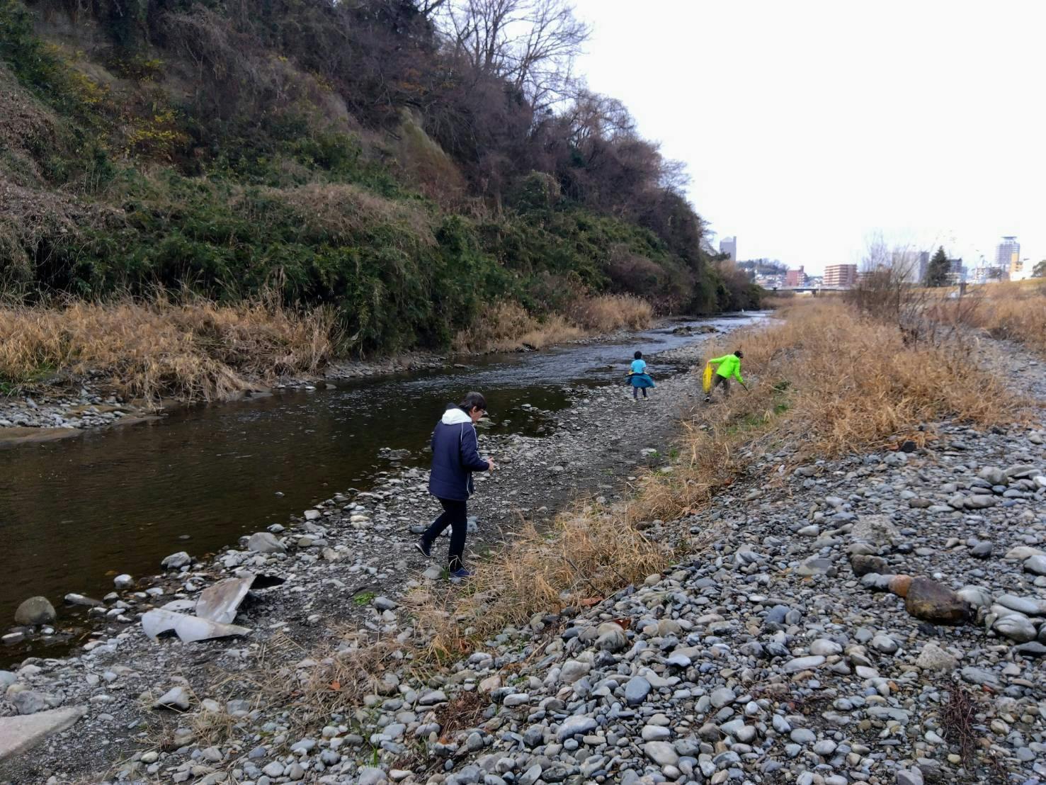 新年2日目は、昨日の大栗川0m起点(多摩川との合流点)から上流部50m付近の清掃に取り組みました。