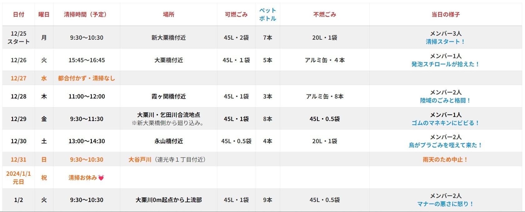 たくさんの人数で多くのペットボトルを拾った日も、たったひとりで思いがけない量を拾った日もいろいろあるのがわかります。