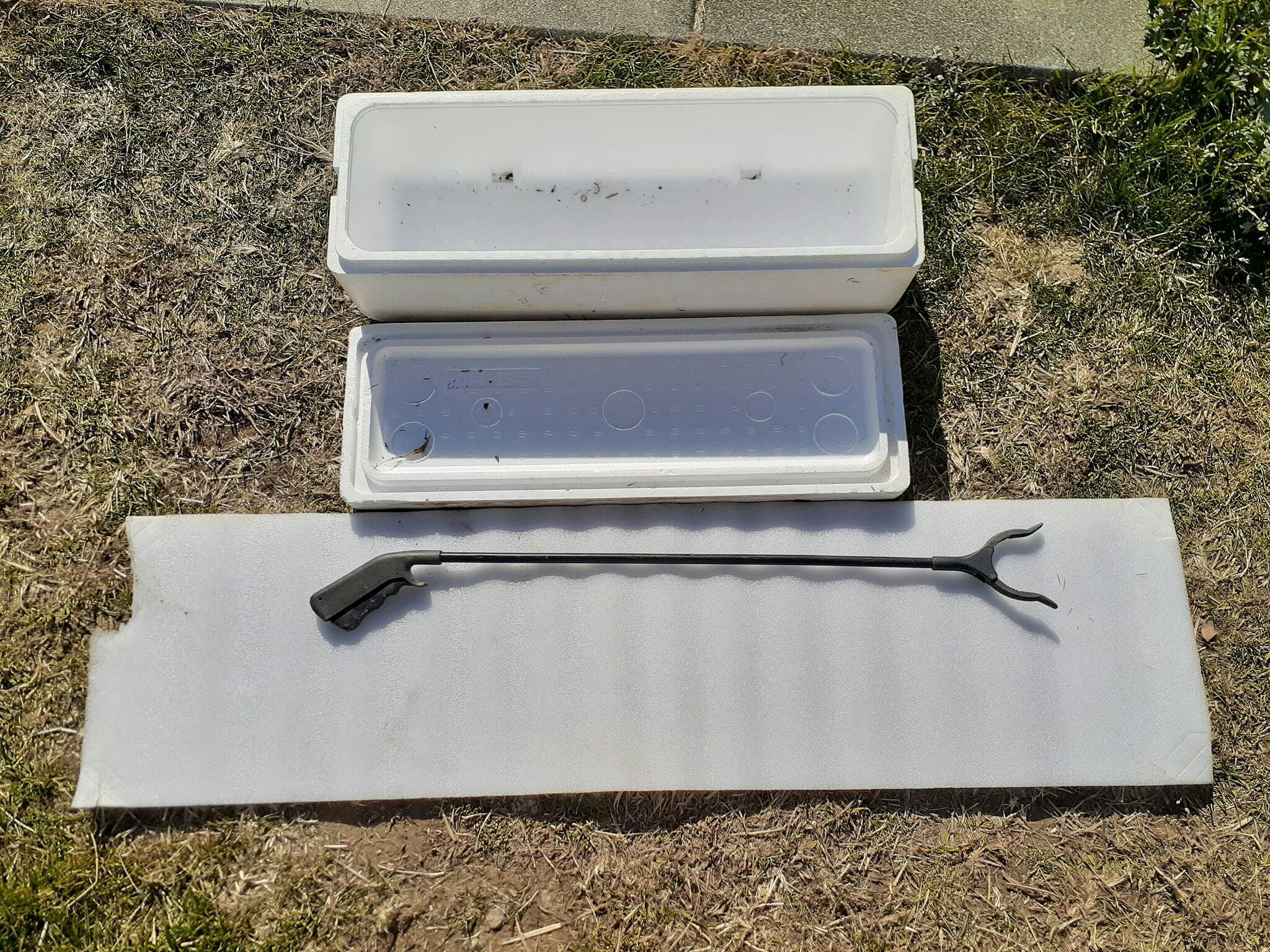 朝、大栗橋へ向かう途中、新大栗橋を通って行くのですが、前々日に一番水深の深いところにあって取れなかった大きなトロ箱が、風の影響で逆の岸に上がっているのをみつけました。急速にマイクロプラになる発泡スチロール、この機会に拾うべきと思い、大栗橋側から拾いに行くことを決め、この日の作業範囲、作業のやり方を決定しました。