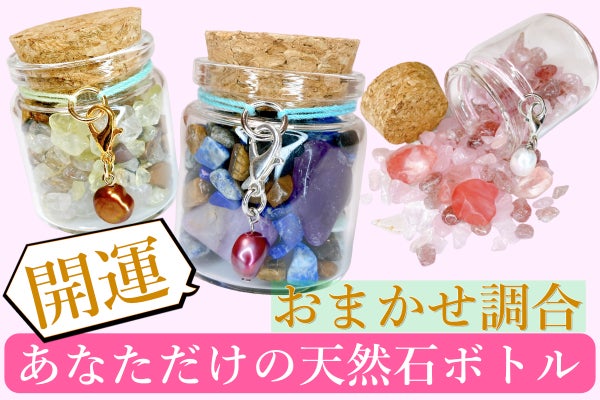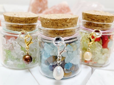 私たちは普段アクセサリーショップを営んでおり、新しく”飾れる天然石”を販売し、アクセサリーがアレルギーで着けられないような方や新しいインテリアを眺めて楽しみたい方に向けて天然石ボトルをつくりました。