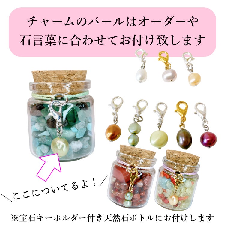 大きいボトルには天然淡水パールのキーホルダーをおまけを小瓶に結びつけてお届け致します。