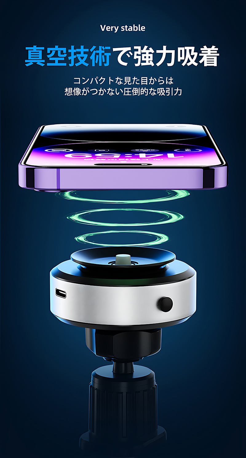 本製品には自動センサーが搭載されており、スマホをポンとおくだけで接触面が真空になり、しっかり固定できます。