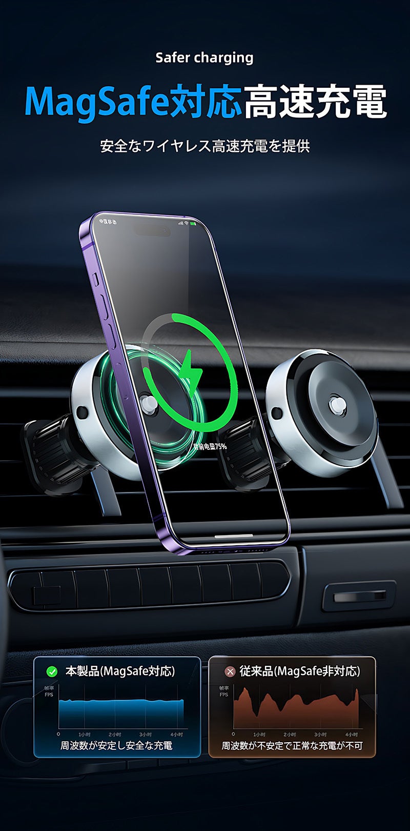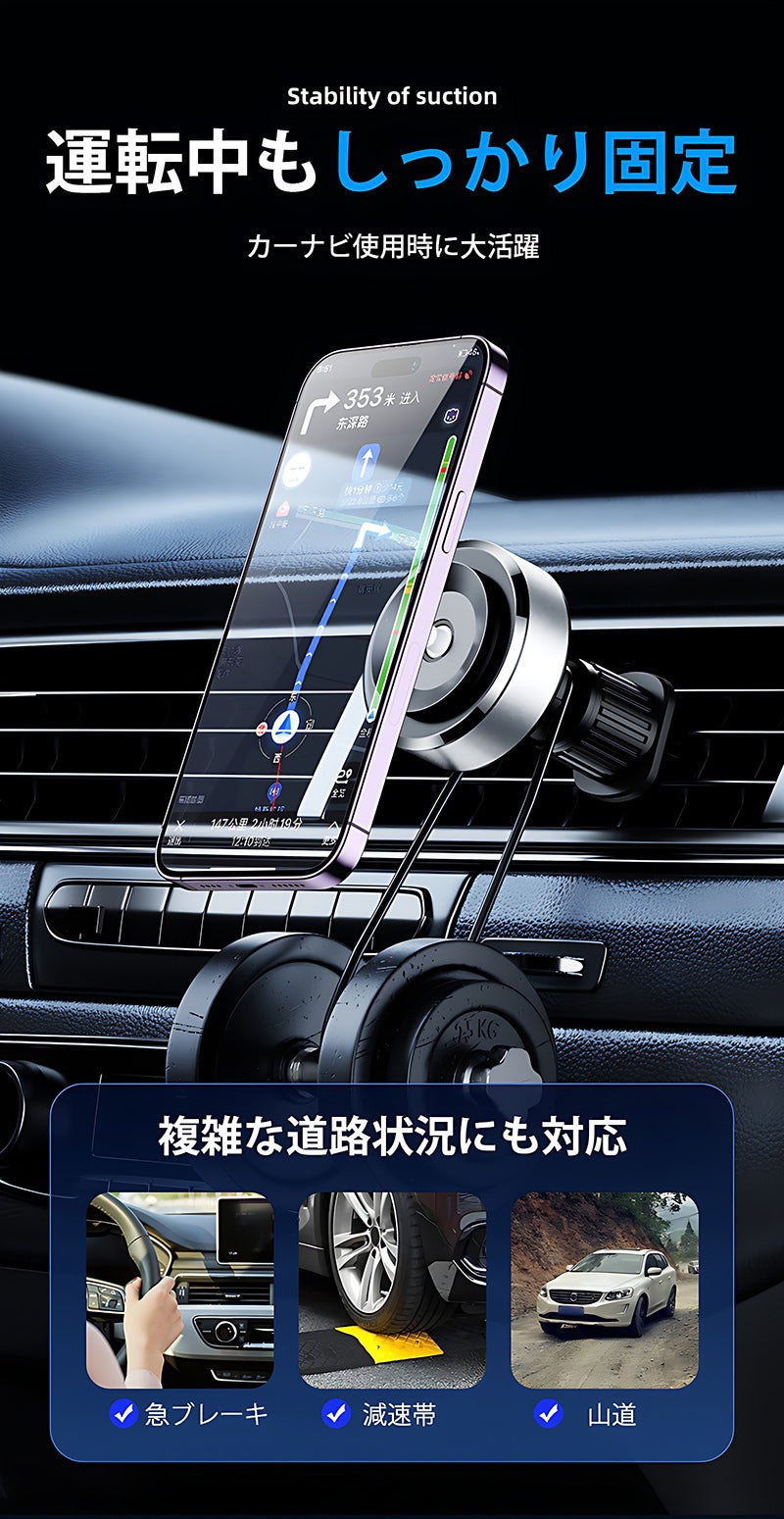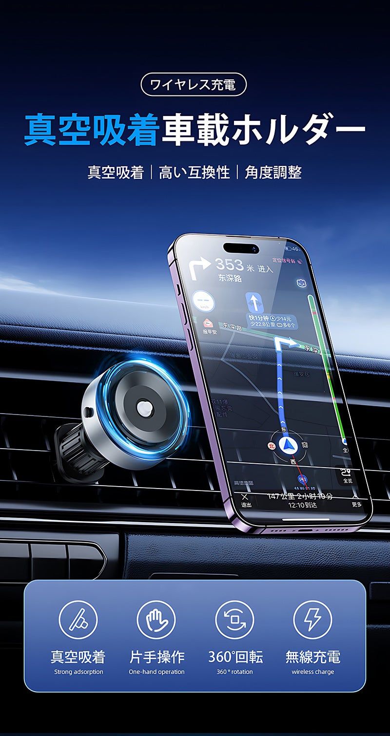本製品には自動センサーが搭載されており、スマホをポンとおくだけで接触面が真空になり、しっかり固定できます。