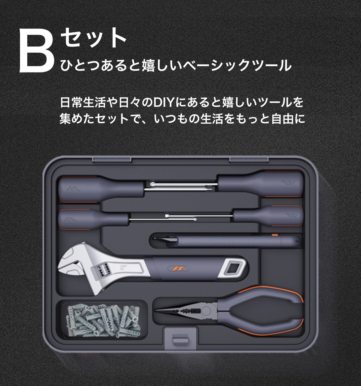Bセットは、多様なDIYプロジェクトに必要なさまざまなツールを提供します。簡単なグリップのためのモンキーレンチ、多目的なグリップポイントを備えたロングノーズプライヤー、リモデリングタスク用のドライウォールネジとプラスチックアンカー、簡単な刃の交換が可能なカッターナイフなど、さまざまなプロジェクトに自信を持って取り組むことができます。