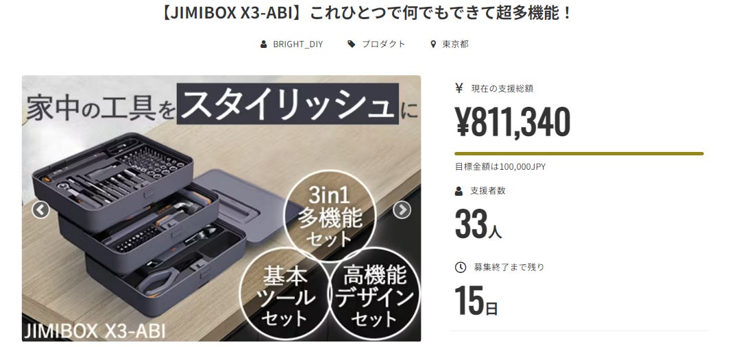この度は「【JIMIBOX X3-ABI】これひとつで何でもできて超多機能!」に支援 頂き誠にありがとうございます!お陰様で、開始から10万円の目標金額を800%達成することができました。< 家中の工具をまとめて統一!使用頻度の高い基本ツールを揃えたAセット、ひとつあるとベーシックな作業の幅がぐんと広がるBセット、ドライバー&ドリル&ラチェットの3in1全部入り贅沢セットのIセットの3種類がコンボになった超多機能工具ボックス!>ご興味のある方、ぜひ支援お願い致します。https://camp-fire.jp/projects/view/725389Brightチームは、当プロジェクトをもっと多くの方に知っていただきたいと考えております。よかったら、FacebookやTwitter等のSNSでのシェア・拡散をお願い致します。#brightdiyどうぞよろしくお願い致します。Brightチーム