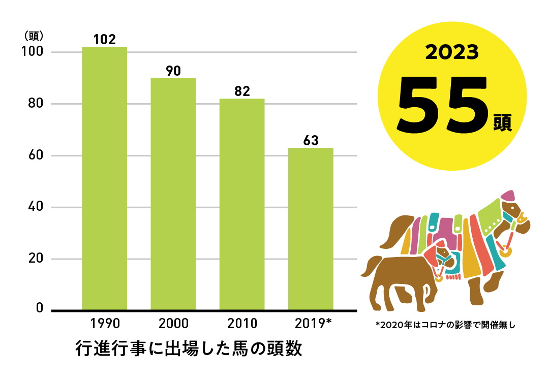 しかし、装束馬の出馬頭数は年々減少しています。1990年には102頭の装束馬が参加していましたが、30年間で約40頭減少。2023年には55頭にまで落ち込みました。