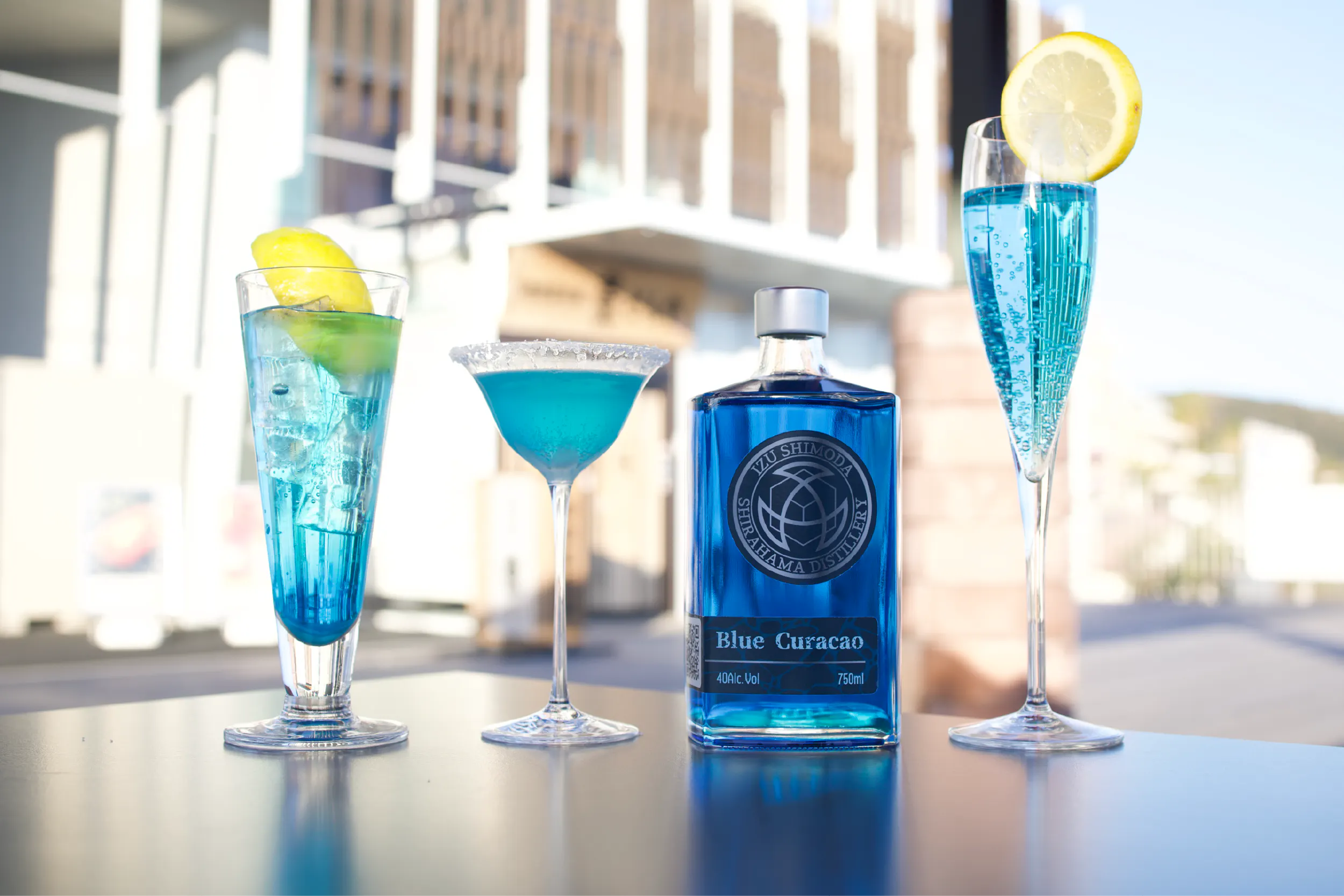 青いお酒として有名な「ブルーキュラソー」です。下田近郊で収穫されたビターオレンジを原料として、丁寧に仕込み・蒸留を行いボトル詰めまで行います。