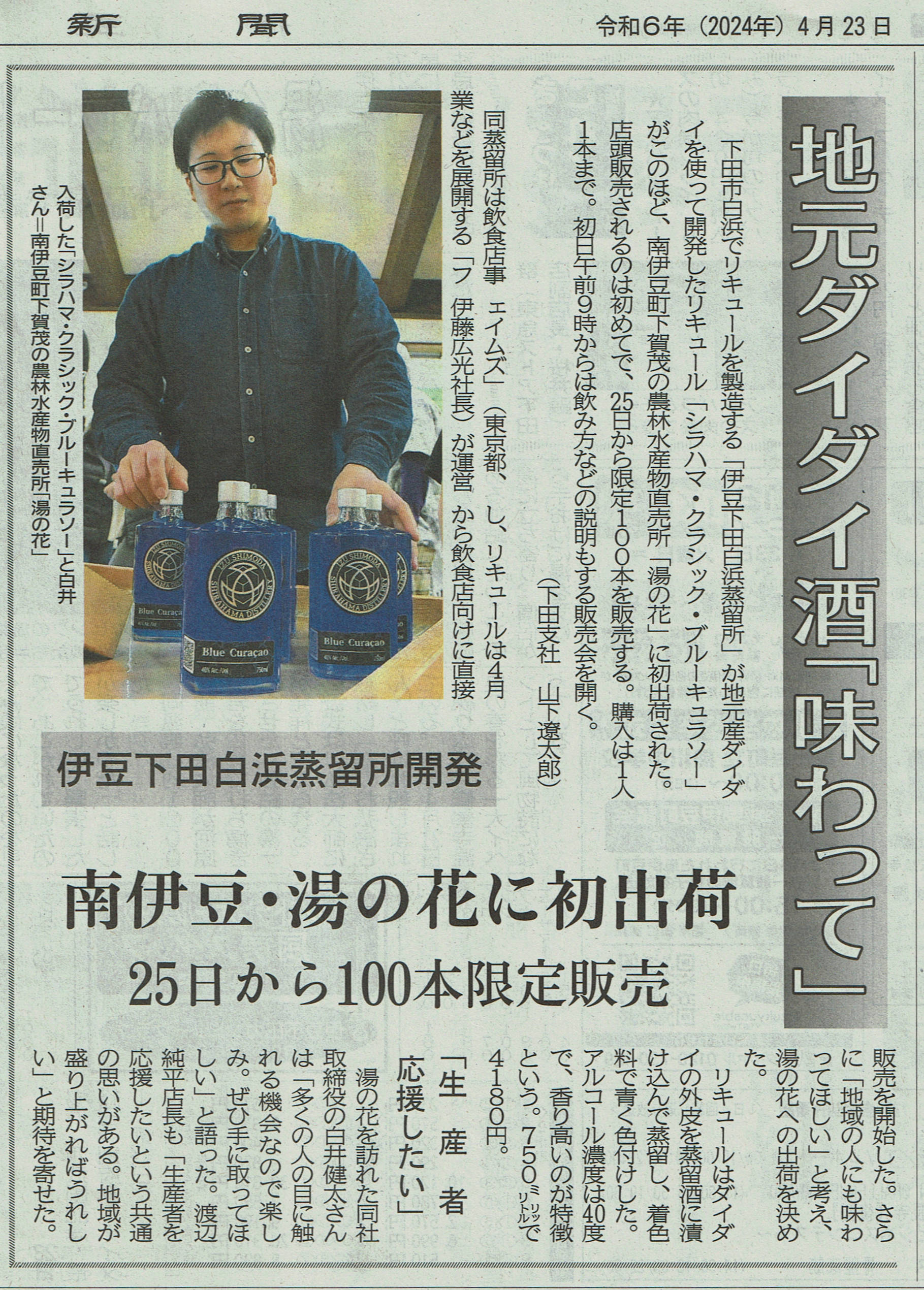 昨日17日、南伊豆にある湯の花直売所にブルーキュラソー100本を納品させていただきました!25日から店頭にて販売を開始できる予定ですので、クラウドファンディングを逃した方や、もう1本ほしいなどございましたら、是非お求めいただけましたら幸いです。販売会のおしらせ湯の花直売所様の一角をお借りし、白浜蒸留所のブルーキュラソー販売会を行います!白井がお邪魔し、直接販売を行いますので、近隣にお住まいの方は是非お越しください!◆日時2024年 4月25日(木)9:00 ~ 16:00