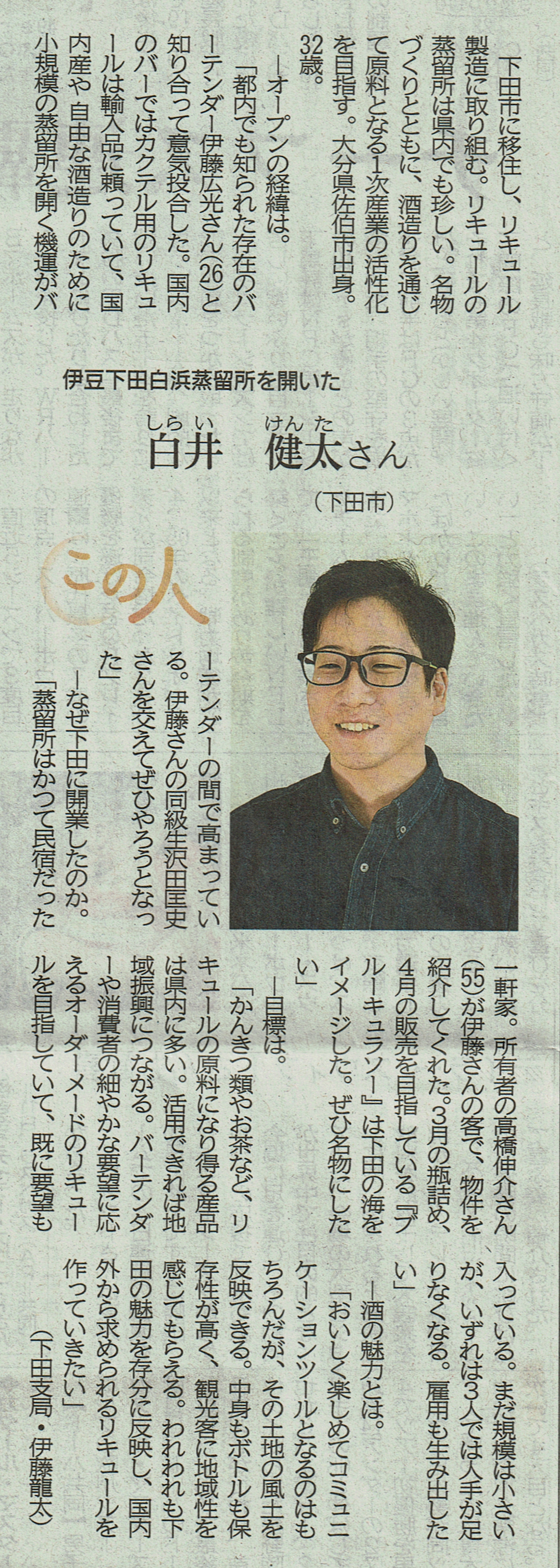静岡新聞『静岡人インタビュー「この人」』2月9日に引き続き、静岡新聞に掲載頂きました!「静岡人」として下田に白浜蒸留所を開業した経緯や、これからの展望などをまとめていただいております。Web版はこちらです。(閲覧には会員登録が必要です)