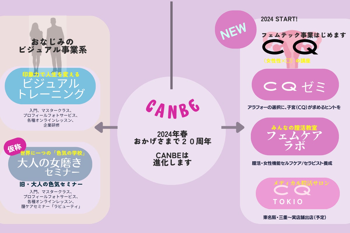 2024年、弊社(有)CANBEスタープロダクションは、会社設立20周年を迎えました。2003年にセミナー事業としてスタートした「ヴィジュアルトレーニング」「大人の色気セミナー」の2講座では1000回以上のメディア取材を受け、全国5拠点、のべ3万人の受講生と成長を続けております。そして本年、フェムテックな学びを提供する「CQ事業部」を発足。「人生100年時代の女性性開花、CQ(子宮)コンシャスな生き方」を提案します。