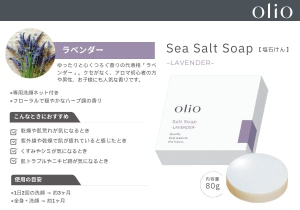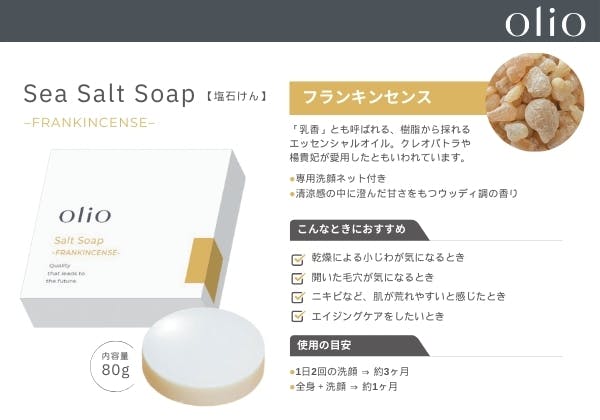 ■天然の塩と植物の恵みを凝縮した特別な石けんお肌をすっきりと洗い上げながら、やさしく整える「Sea Salt Soap 塩石けん」。香りはフランキンセンスとラベンダーの2種類をご用意しました。