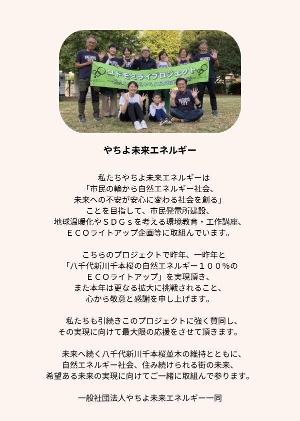 今日は八千代新川千本桜ecoライトアップのライトアップを担当するやちよ未来エネルギーの皆様から応援メッセージをいただきましたのでご紹介します。
