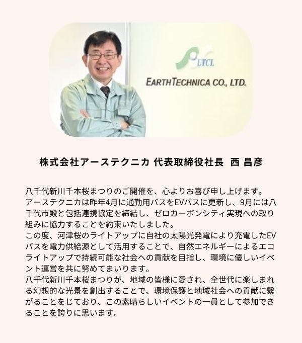 株式会社アーステクニカの代表取締役社長 西昌彦様、応援メッセージをありがとうございました。エコライトアッププロジェクトにご協力いただけること、心から感謝申し上げます。