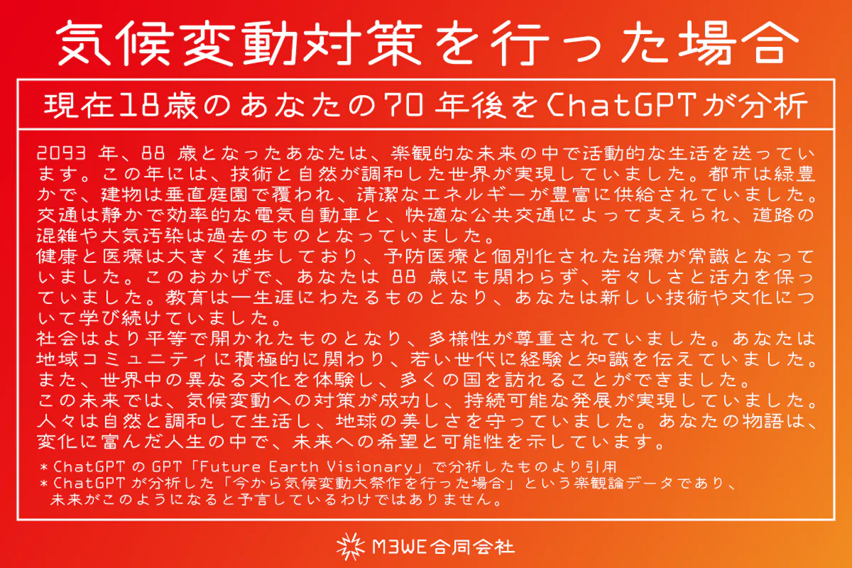 私たちは、マスコミ等の情報で「このまま気候変動が進むと」などというものを目にすることがあります。例えば100年先の桜の開花シーズンや、100年先の紅葉のシーズンをAIで分析したものを聞いてもあまりイメージできません。しかし、「70年後の自分の暮らし」となると、「将来こうなるの?」と驚くのではないでしょうか。また、現在18歳くらいのお子様をお持ちのご両親は、「子どもが88歳になる頃にはこんな未来が来るの?」と思い、気候変動に対する意識が変わるかもしれません。