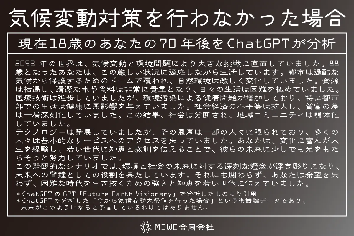 「気候変動対策に失敗した2050年の東京をChatGPTに描画してもらった」はこちらからご覧ください。