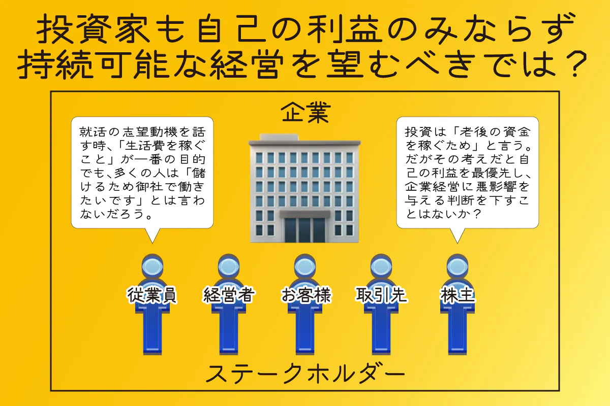企業にとって、従業員も株主もステークホルダーです。しかし就職活動で面接を受ける際に、本当は生活費を稼ぐことが目的でも、志望動機を問われた時にそのようなことは言いません。しかし今、投資家は利益最優先で投資します。ですが従業員も株主も、会社にとっては同じステークホルダーなのです。もし株主が会社の持続可能な経営を無視し利益最優先で行動すると、会社の経営に悪影響を与えることもあります。