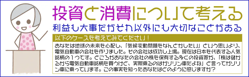 ・気候変動問題に直面するのは若い世代です。お子様が将来を心配しているのに、ご両親が目先の利益最優先で気候変動などを意識せずに投資するわけにはいきません。それはお子様の未来を暗くしていることを意味します。そこでこのプロジェクトでは「親子で投資を学ぶ」ことを意識し、どちらの本にも同じ目線で株式投資について解説します。「親子で同じ目線で株式投資の学習ができる」というメリットがあります。