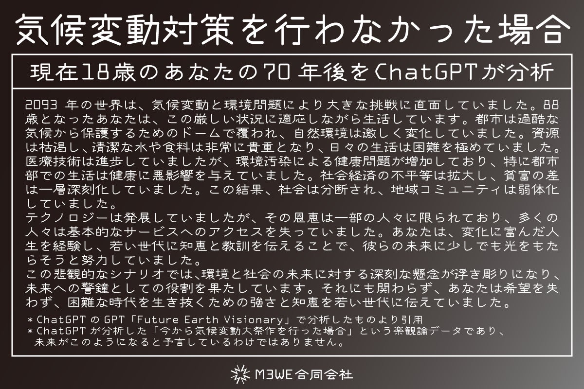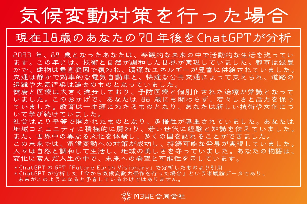私たちは、マスコミ等の情報で「このまま気候変動が進むと」などというものを目にすることがあります。例えば100年先の桜の開花シーズンや、100年先の紅葉のシーズンをAIで分析したものを聞いてもあまりイメージできません。しかし、「70年後の自分の暮らし」となると、「将来こうなるの?」と驚くのではないでしょうか。また、現在18歳くらいのお子様をお持ちのご両親は、「子どもが88歳になる頃にはこんな未来が来るの?」と思い、気候変動に対する意識が変わるかもしれません。