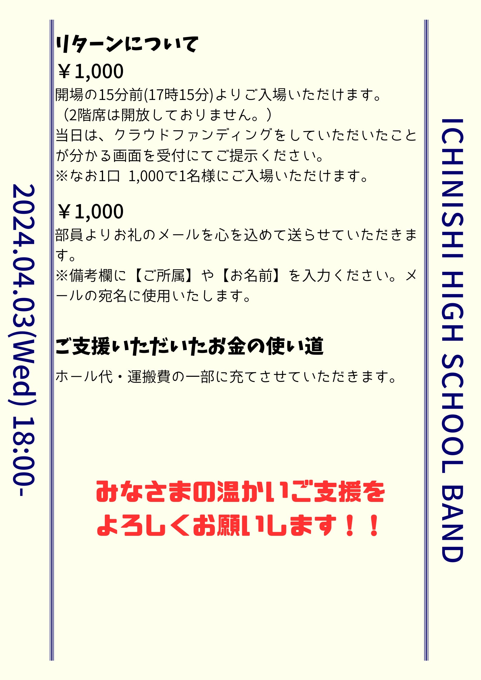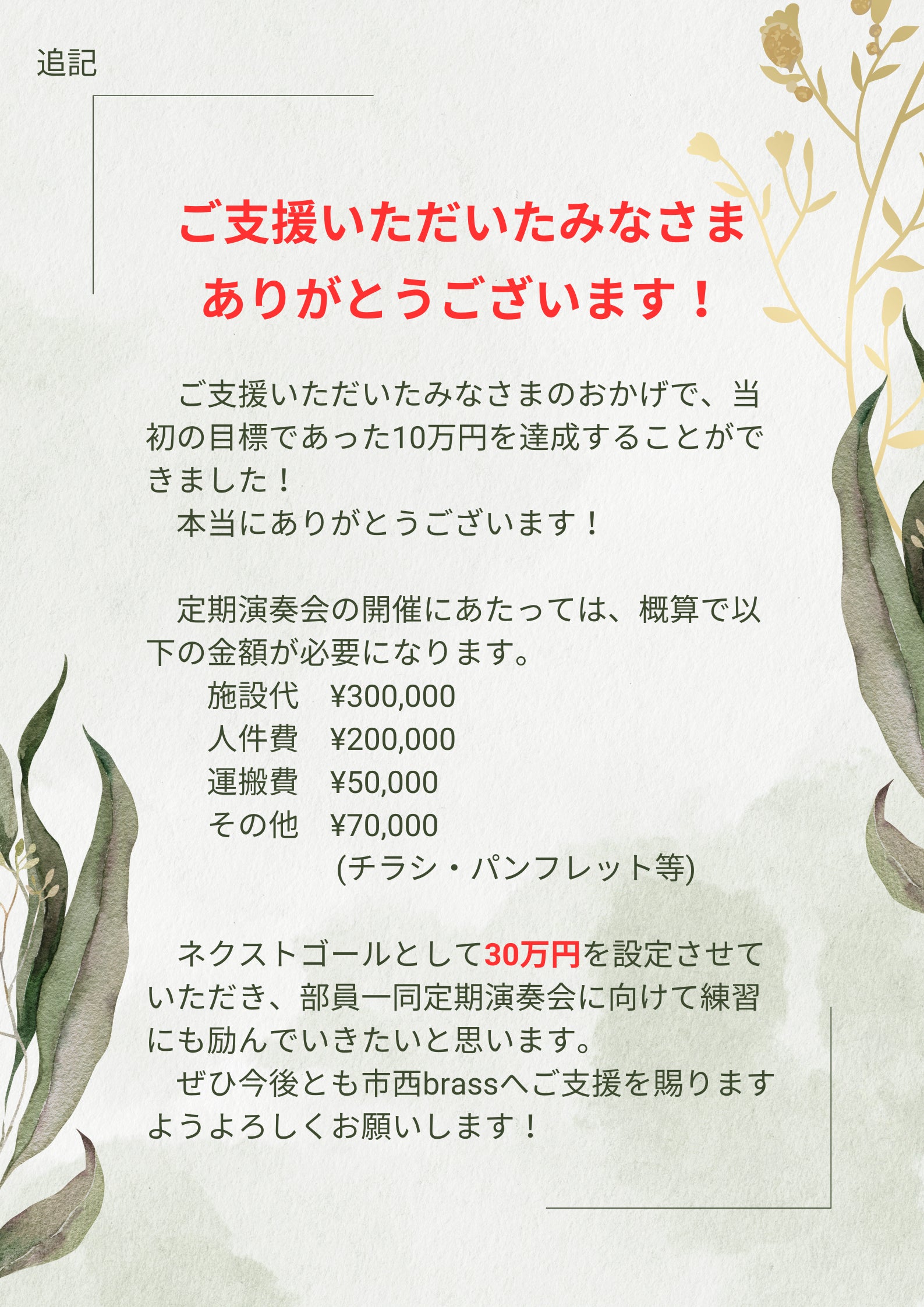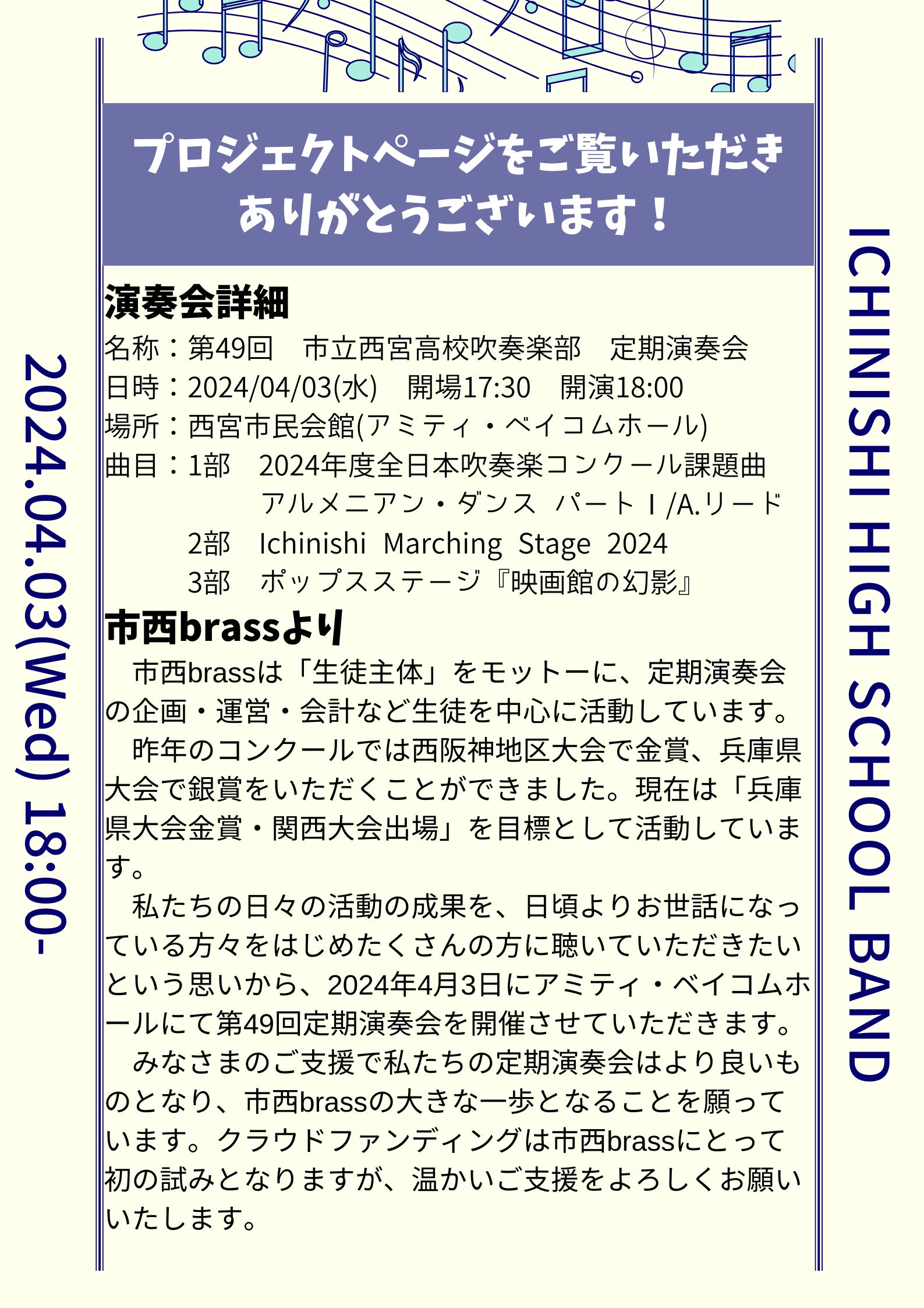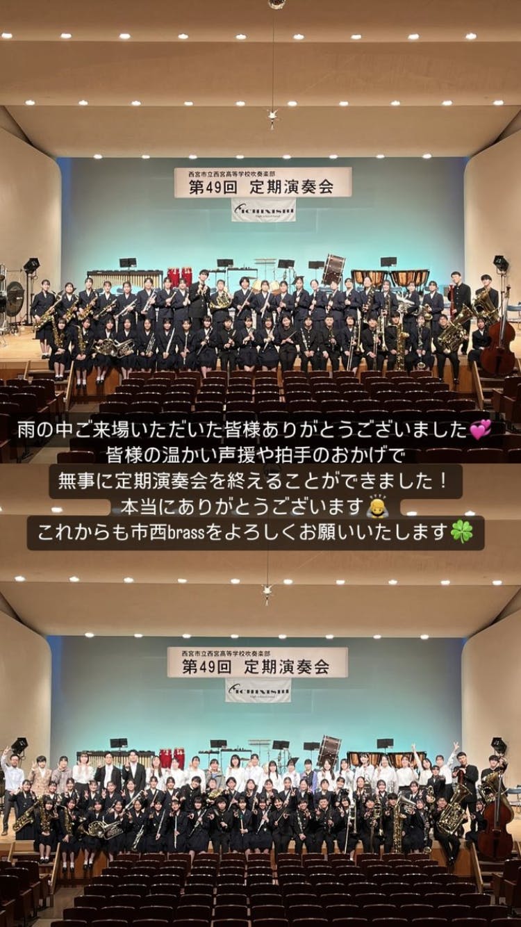 2024/04/05 00:00昨日、無事定期演奏会を開催することができました。雨の中お越しいただいたみなさま、本当にありがとうございました!初の試みとなるクラウドファンディングでしたが、温かいご支援をありがとうございました。応援のメッセージもいただけるクラウドファンディングの良さを実感させていただきました。これからも、市西brassといえばクラウドファンディングと言われるようになるまで挑戦させてもらえたらと思っています。これから市西brassはコンクールに向けて、また歩み出していきます。これまでにない困難や辛さも経験することだと思いますが、定期演奏会の経験を糧に乗り越えていきます。今後とも応援のほどよろしくお願いします!※リターンのメールにつきましては、後日部員より送らせていただきます。顧問 足立慎弥 もっと見る