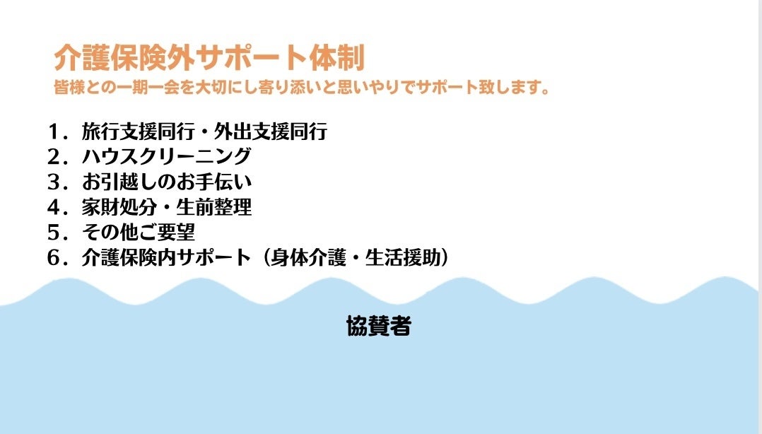 日本では介護保険制度という仕組みがあります。しかし、介護保険ではできること、できないことの区別がありできないことが多くあります。また、介護の保険内では決まった日にち時間でしか支援できず中には介護負担が介護保険内では足りていない方がおられるのも現状です。
