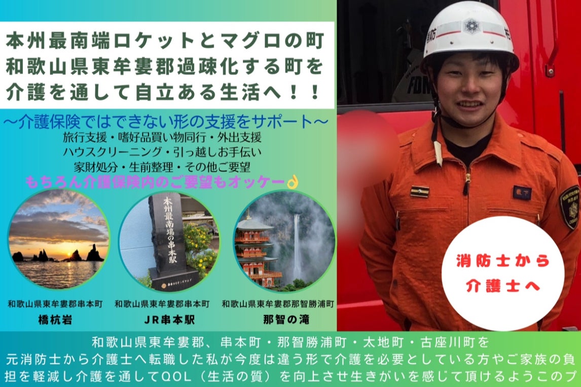 しかし、約人口6万人(隣接の新宮市含む)のうち約2人に1人(45%)が高齢者。これからさらに若者は都市部へ進出し高齢者だけが増加する可能性が高い状況です。都会に比べて元気な方が比較的多いですが田舎ということもあり徒歩圏内での行動に難があるのが特徴です。また、福祉施設及び、事業所数が少なく担い手の人員不足なのが現状です。今の状況を打破するべく私の第2の故郷である和歌山県東牟婁郡の介護を通して街を盛り上げていきたいと思います。