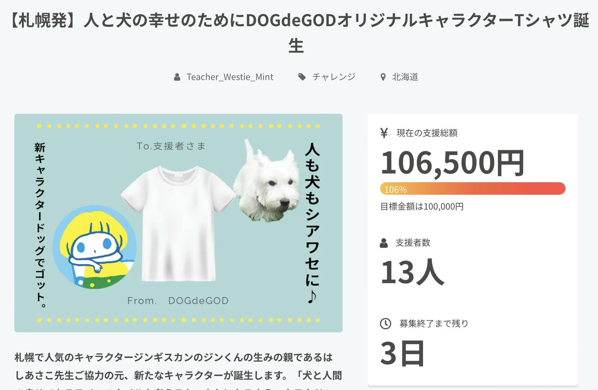 札幌で人気のキャラクタージンギスカンのジンくんの生みの親である、はしあさこ先生ご協力の元、新たなキャラクターが誕生します。北海道からそして全国の皆さんと一緒に「人と犬の幸せのためにライフスタイルを考えるキッカケになるよう」クラウドファンディングにて皆さんと一緒にTシャツづくりをしていきます。