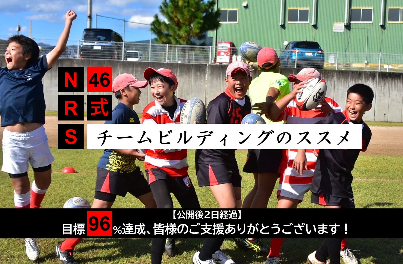 【公開後2日経過 96%達成】NRS46式チームビルディングのススメ ~共感と連携で築く強力な絆~多くの方々からの温かいご支援、応援メッセージに感動させていただき、感謝の気持ちでいっぱいです。多くの方々に応援され、選手はもちろん育成者、コーチも幸せな気持ちでいっぱいです。本当にありがとうございます。本日はNRS46式チームビルディング ~共感と連携で築く強力な絆~についてご紹介します。1.NRS46伝統のチームビルディングとは?とってもシンプルなチームビルディング、しかしながら気持ちを一つにしてやらなければ成功しない、その名も「共感と連携ですなぐ強力な絆」【ルール】5‐6人が縦に一列並び、人と人の間にボールを挟み、ボールを落とさずに10M前進する、以上。とっても簡単です。正直余裕です。なかなかうまくいきませんね~見ている以上に難しいです。このゲームの難しいところは、たった10mを進むだけなので先頭は焦ってしまいます。それに追いつくべく、2人目、3人目は無理してついていきます。徐々にその焦りが後ろに伝播され、追いつかなくなりボールを落としてしまいます。こういう事って、ラグビーでもあるし、チームスポーツではよくありますね。先頭がいかに焦る気持ちをコントロールし、それを2人目、3人目が感じ取り、最後尾は後ろから全体を鼓舞すべく押していく。まさにチームとしての一体感と先頭と最後尾のチームコントロール、そして何よりチーム全体のコミュニケーションが求められます。2.埒が明かないので、コーチの見本ここは大人の威厳とコーチの一体感を示すべく、本気の姿を見せます。このゲームに大人も子供もありません。目指すは一発成功、子供達から「コ、コ、コーチってやっぱスゲーな」、この一言のみです。しかし、前半は好調なものの後半調子に乗って、一体感を出せずに失敗です。3.さて、子供たちは成功したのか?子供たちはすごいです。大人の失敗を見て学びます。コーチの失敗を見て、こうしたらええやんというアイデアが口々に出てきます。彼ら自身が声をかけ、「ゆっくりゆっくり」とか「もっと押せ」とかしっかりコントロールします。これこそがNRS46期が目指す「自ら考え行動できる選手」ですね。それでは、成功をどうぞ!このチームビルディング、実は彼らが小学1年生の時もやってます。この時は1年生なので説明しても全然理解できません。あーやこーや言ってたのですが、途中からコーチは黙って見守ろうと。そして、待つこと1時間。。。かわいいですね~喜び方は全く変わってないですね~4.チームビルディングからの学び■リーダー(先頭)は引っ張るだけではないついついリーダーは気負ってしまい突っ走ってしまいます。でも振り向けば誰もついてきてない。そんなことも多くあるかと思います。フォローしてくれるチームメートの息遣いを感じましょう。一人じゃないよ、リーダー!■リーダー(先頭)以外の突き上げも大切チームを引っ張るのはリーダーだけ?そんなことはないです。リーダー以外のメンバーもしっかり先頭を後ろからフォローして押してあげないとチームは前に進みません。ぎゅっと身体を寄せ合いみんなで前に進もう!成功するときも失敗するときも、みんな一緒だ!■黙っていてもわからない、声をあげよう今の状態もっと押して!もうちょっと待って!黙っていても誰もわかりません。コミュニケーションが大切です。今、どんな状態かを共有して、共感してもらうことは大切ですね。そしてコミュニケーションは具体的にすると効果的にですね。■ラグビーは、少年をいちはやく大人にし、大人にいつまでも少年の心を抱かせる見ていただけましたでしょうか?大人の本気と子供冷静さ。そして成長する子供。やっぱラグビー最高です。5.おまけコーチも一応、成功しましたよ。(ちょっとズルしたけど…)だって、僕たち46期のコーチの一体感はどこにも負けないから。そして、子供たちもひくくらいの喜びよう。本日も長い長い投稿に最後までお付き合いいただき、ありがとうございました。いつでも全力、大人も全力、そんなNRS46期を引き続き応援いただけますと幸いです。