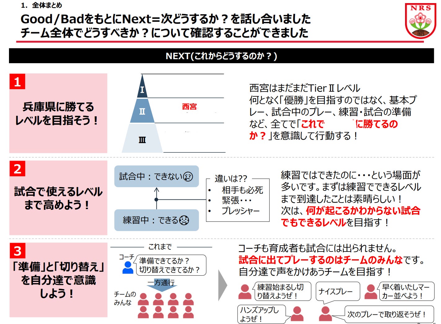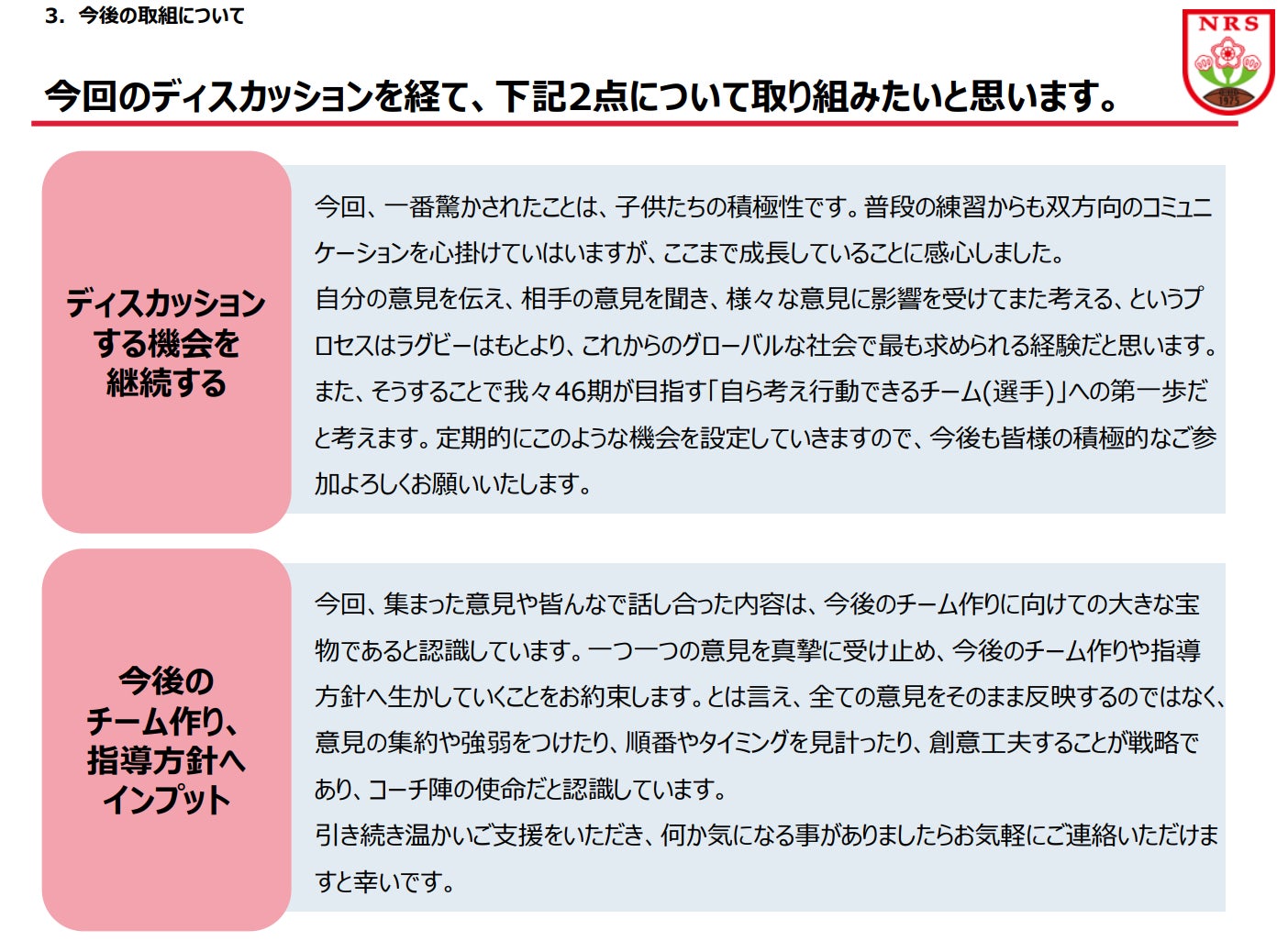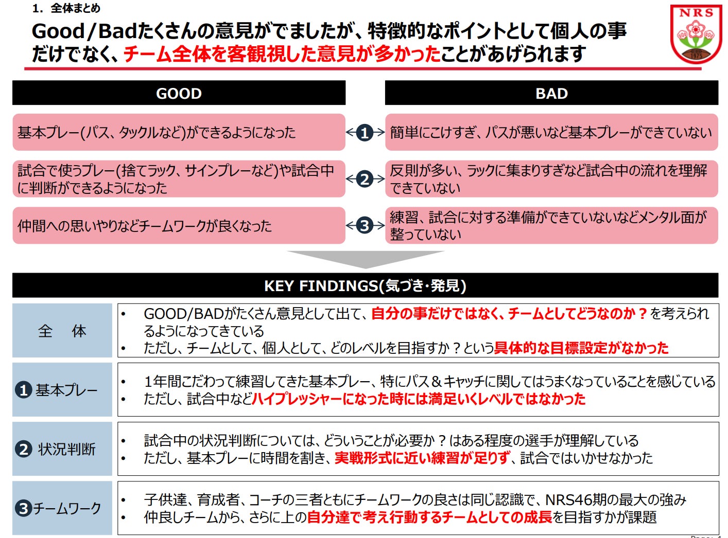 これはまとめの資料の一部になりますが、選手、育成者、コーチにとってとても良い経験になりました。お互いが考えていることを知るために、考えて、書いて、話すというプロセス、そして自分の言葉で話すことも難しさも学ぶことができました。
