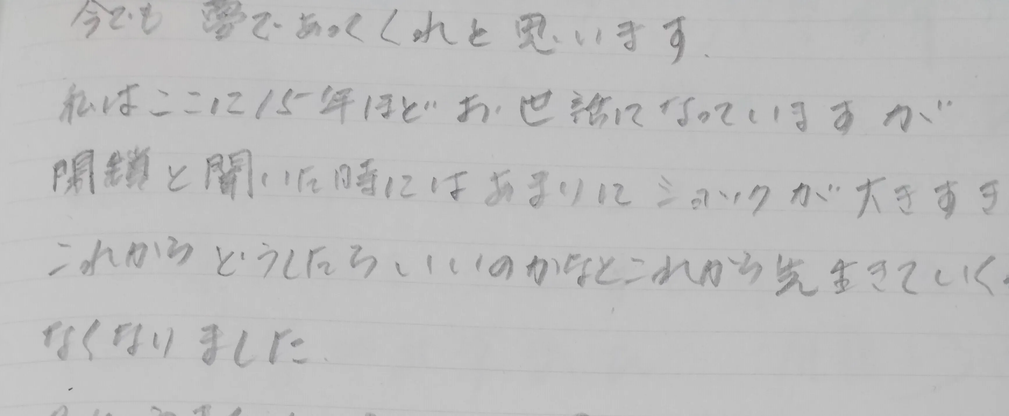 閉めると聞く1ヶ月前には、新しい方も3人利用され出したものの翌月には閉鎖の報告をせざるを得ませんでした。