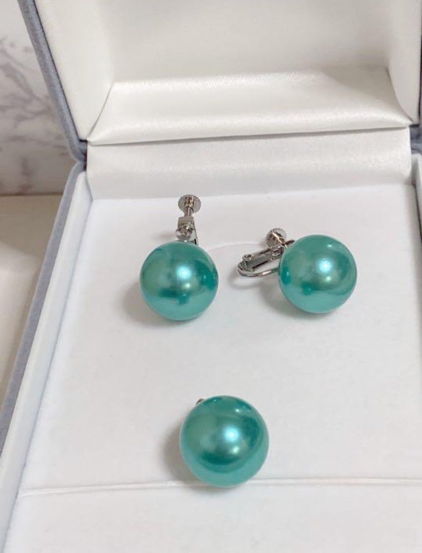 真珠はシェルパールを使用し、複合された特殊な染め方で、ティファニーカラーのティファニーブルーが完成しております。
