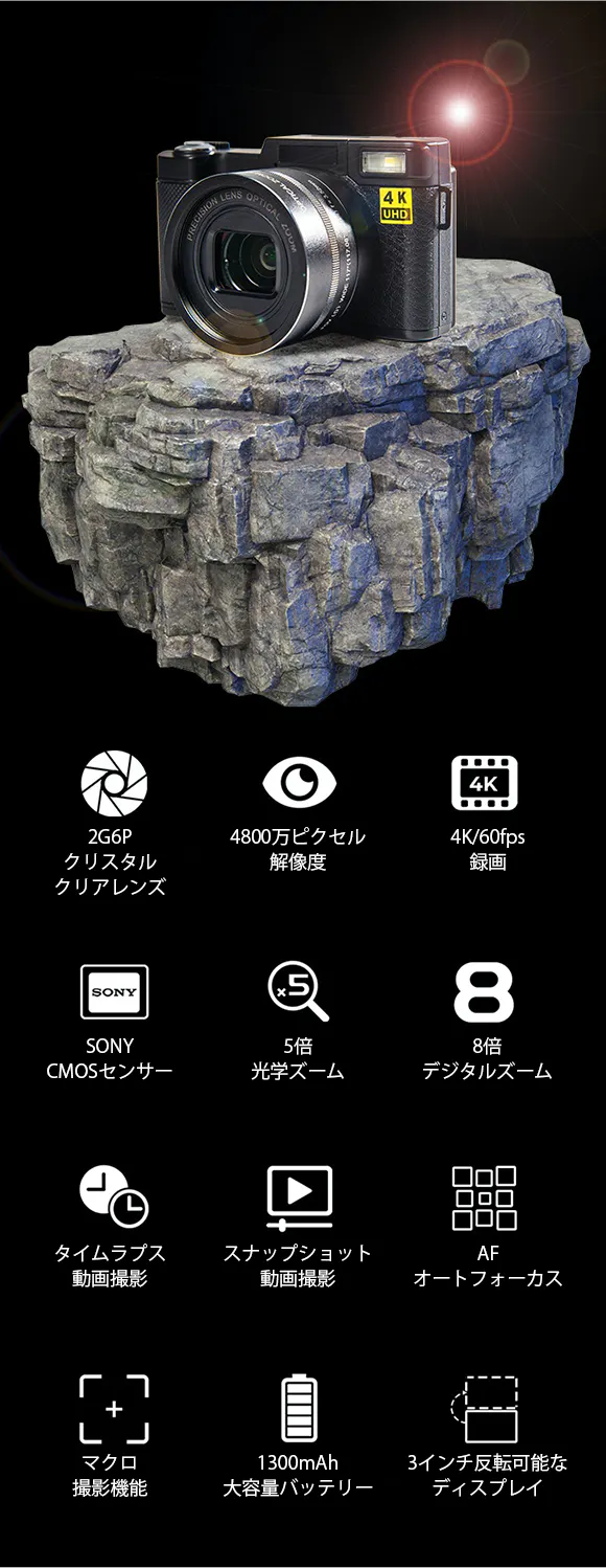 「AMKOV R5」は使い勝手が良く、スマホレベルの使用感にも関わらず、4,800万の解像度と4K/60fpsのHD記録性能を備えたSONY CMOSセンサーが備わっているため、常に高解像度の本格的な記録が可能となっております。