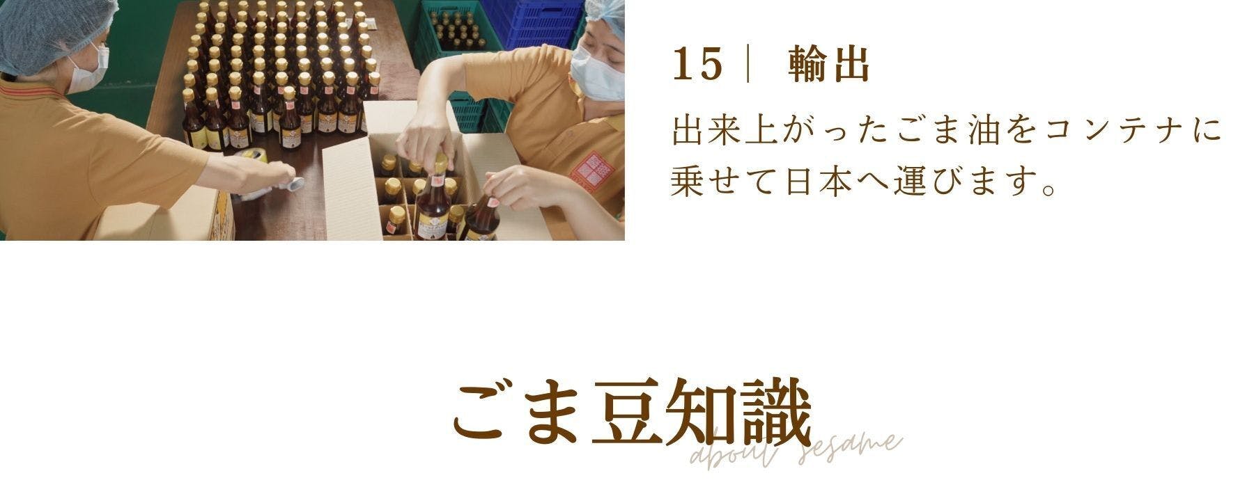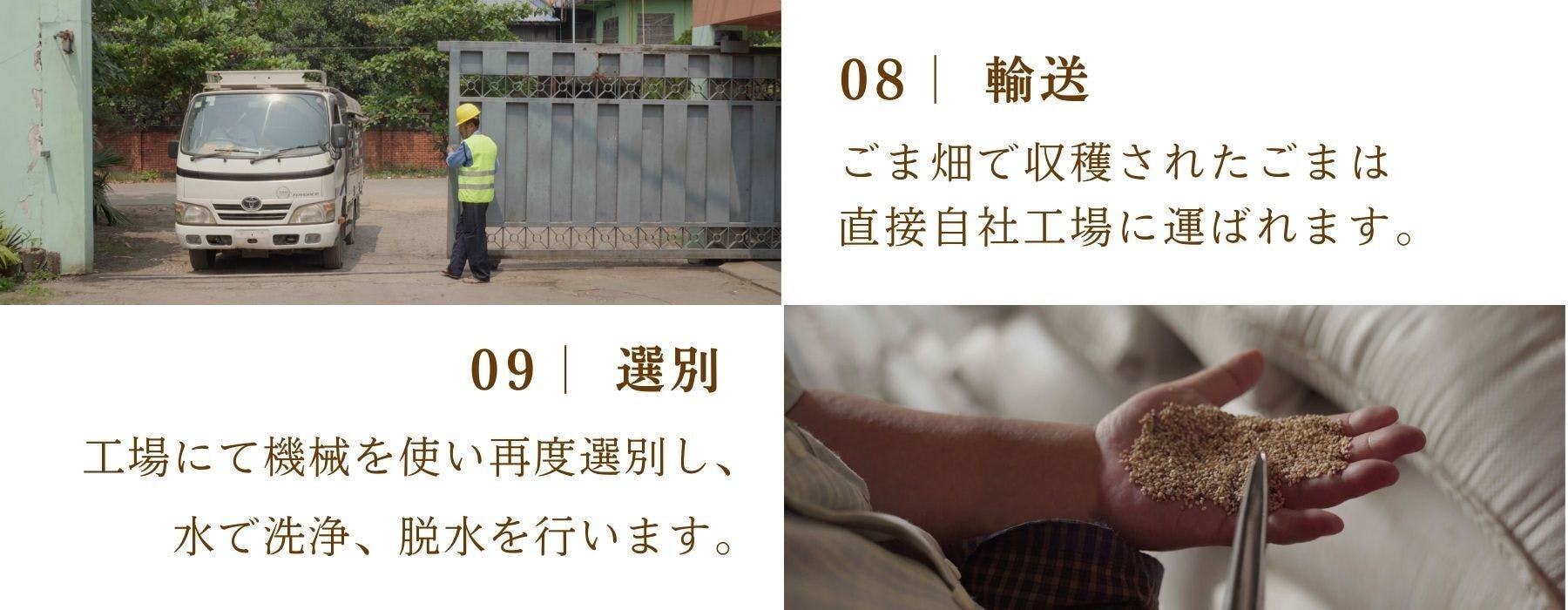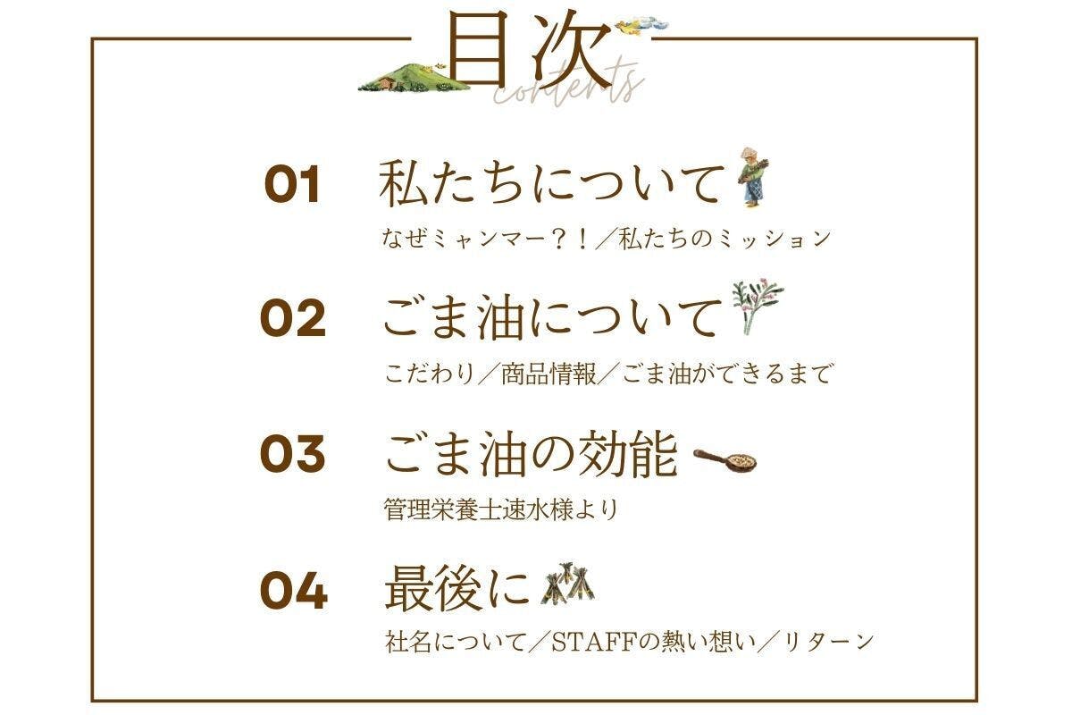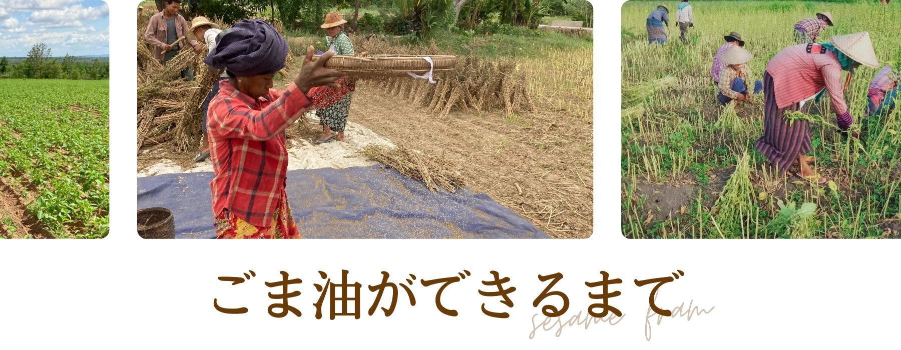 ミャンマーのごま畑で育てられたごまのみを使用し、ヤンゴンにある自社工場にてごま油を抽出しています。