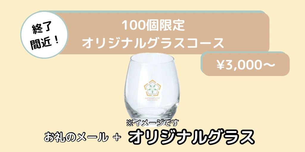 naturadistillのロゴ入りのオリジナルグラスをお届けします。手にフィットする小ぶりで丸いフォルムが可愛く、口がすぼまったデザインで飲み物の香りを留めてくれる「ラウンドグラス」の予定です。