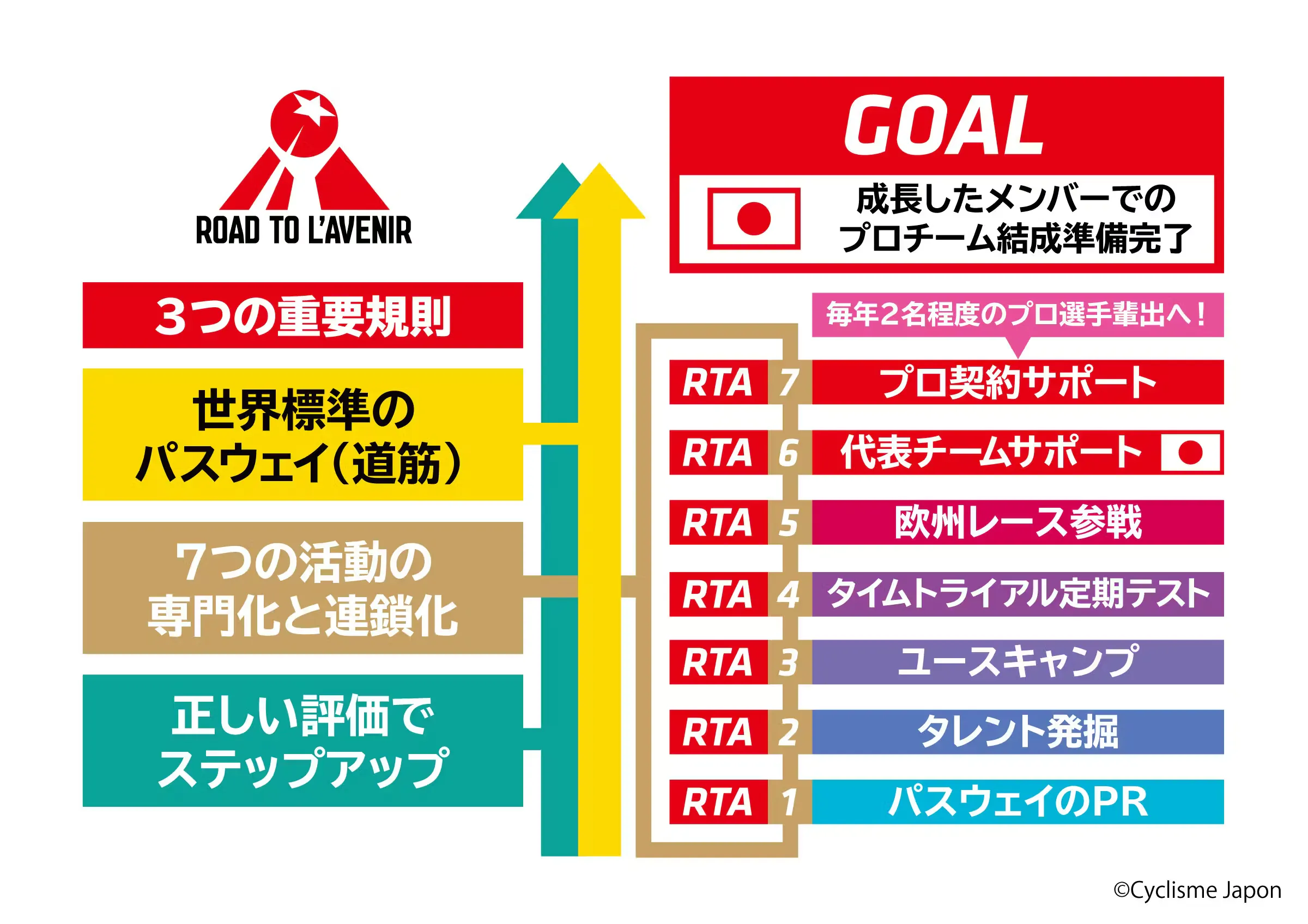 本「ロード・トゥ・ラヴニール=Road to l'Avenir (RTA)」プロジェクトは世界のプロ選手を目指すチーム・選手にとっての「世界常識」を再整理し、現在〜近未来の業界情勢に即したアプローチにて正面から地道に、かつ効率よく世界への到達を目指してゆくと言うものです。